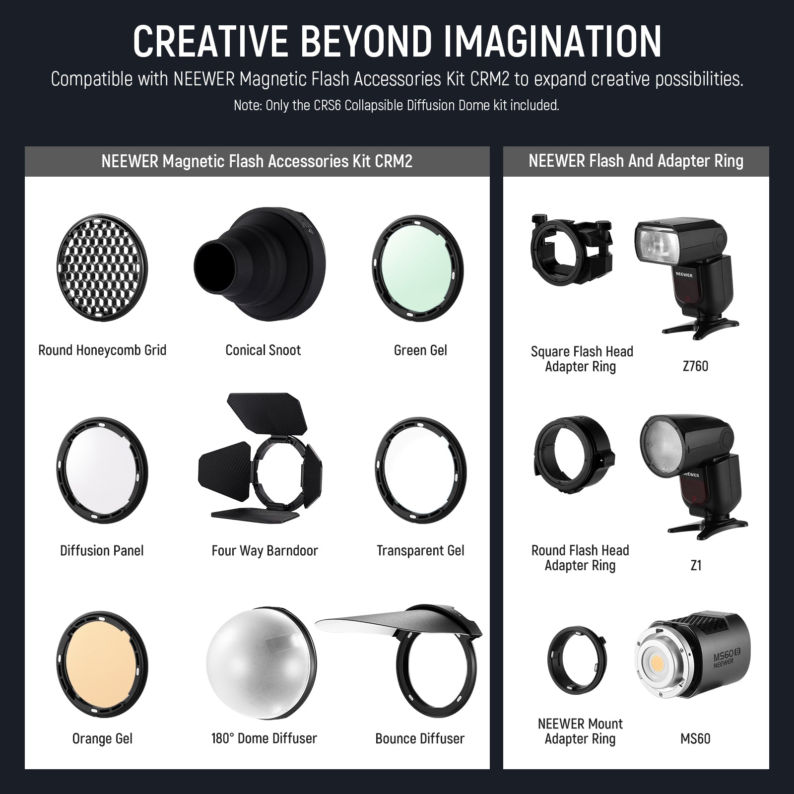 - Three Adapter Rings Included- Effortlessly mount on square heads, round head, or other external flashes and continuous lighting sources with the corresponding adapter rings. Compatible with Godox V1 NEEWER Z1-C Z1-N Z1-S Z2 round head flashes, compatible with NEWEER Z760 NW700 NW620 NW645II TT560 square head flash, and compatible with NEEWER Mount Video Light MS60B MS06C MS150B Q45 and more NEEWER CRS6 Diffusion Dome with 3 Adapter Rings, Compatible with Godox V1 NEEWER Z1 Z2 Round Head Flash a