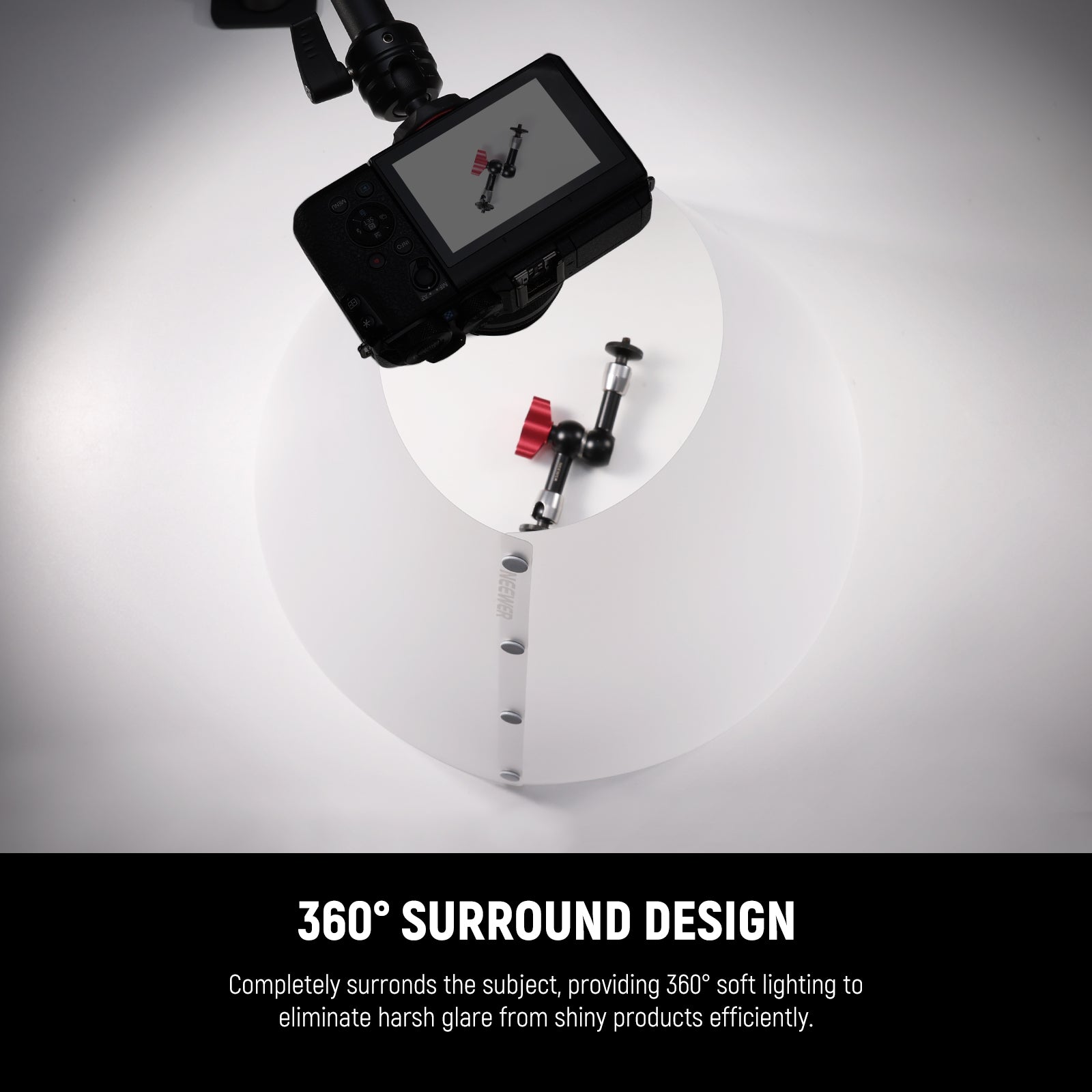 - 360° Light Cone Surround Design- The light cone for 360 degrees surrounds the subject, providing 360° soft lighting adjustment to eliminate harsh glare from shiny products efficiently. The slanted top opening allows for easy shooting and offers diversified angles to capture the best shots of your subjects