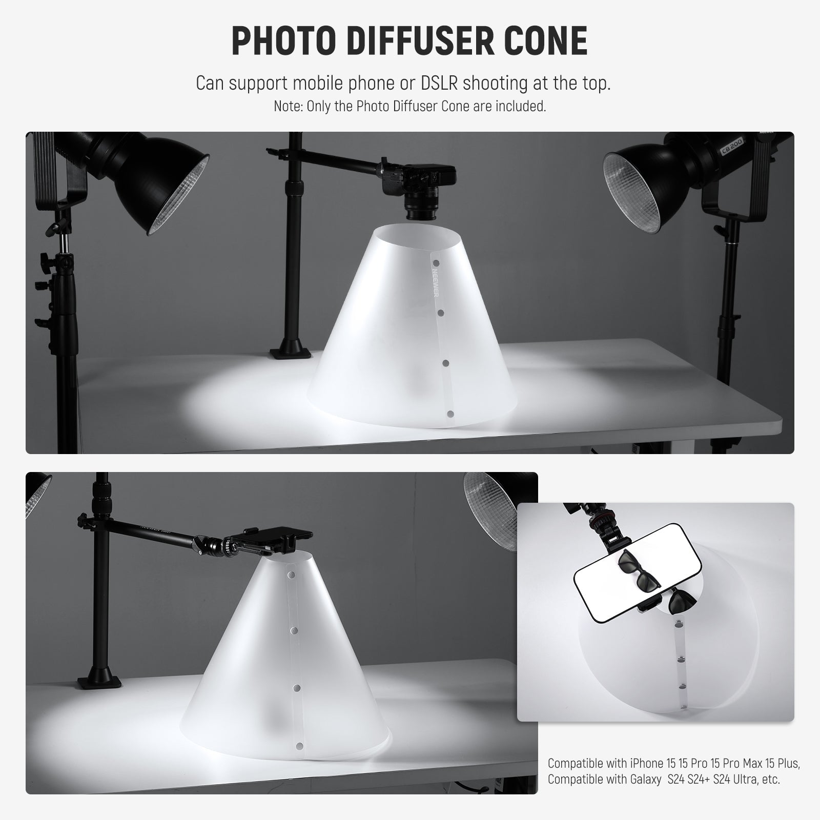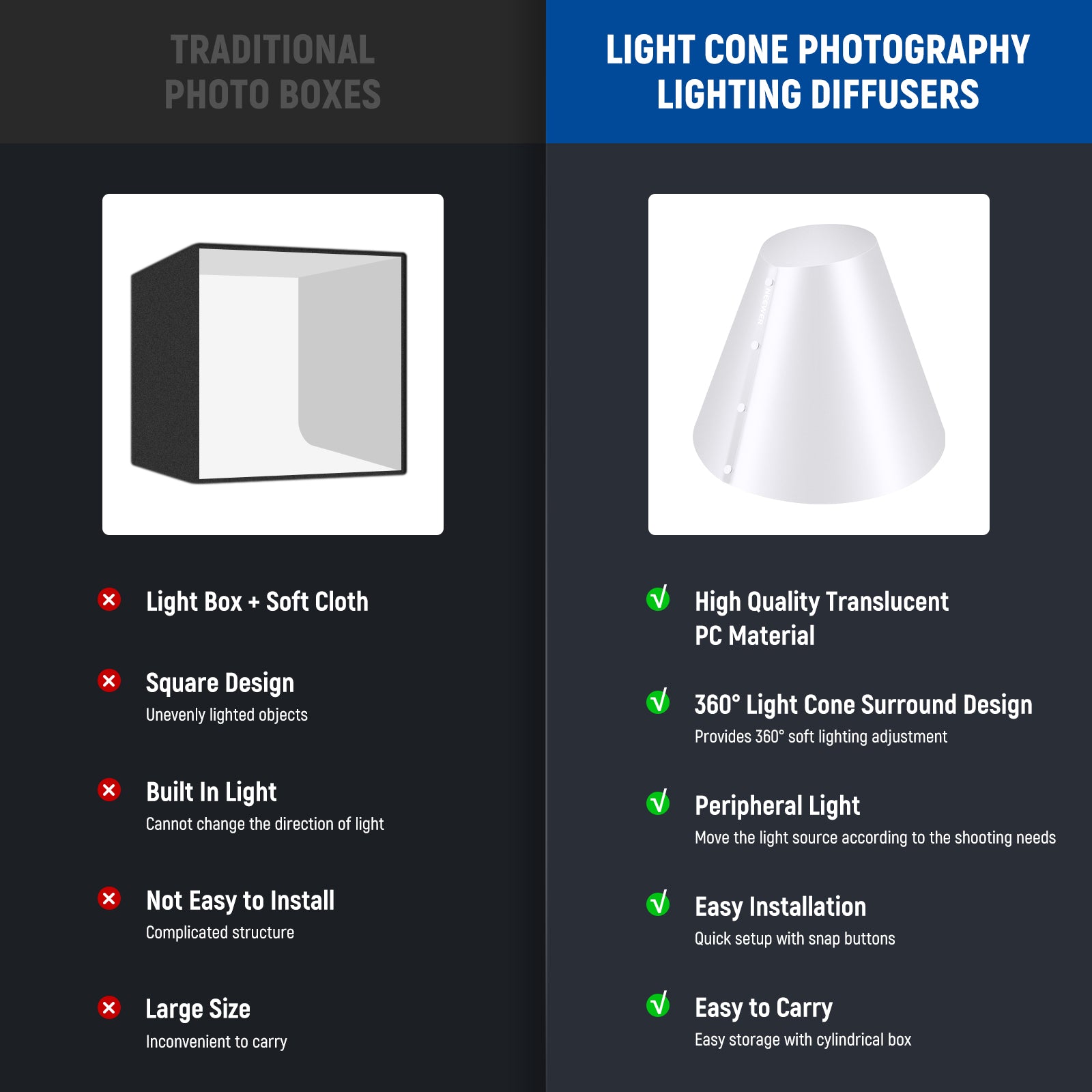 - New Alternative for Efficient Reflection Removal- Crafted from premium PC material with a translucent color, NEEWER photo diffuser cone, a new trend alternative to traditional photo boxes, evenly diffuses the strong flash light to reduce overexposure and harsh shadows on the object. It creates softer and more natural lighting across your subject to ensure your photographs are clear, stereoscopic, and professional
