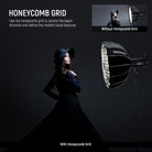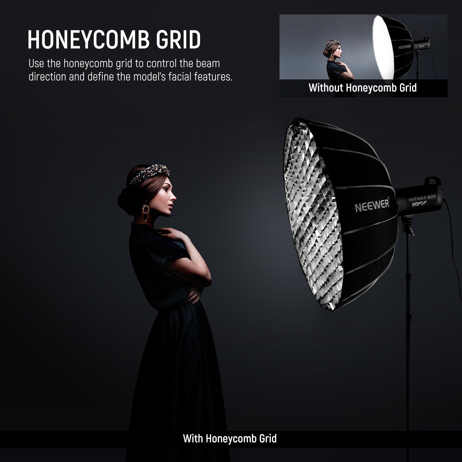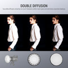 - Multiple Reflective System- The all-metal beauty dish minimizes harsh flash light spots, the two internal and external diffusers combine for an even softer and more diffused light, and the honeycomb grid directs light and reduces spill, providing a distinctive soft yet punchy lighting effect that defines the model's facial structure. Two white diffusers can be attached via touch fasteners for easy assembly