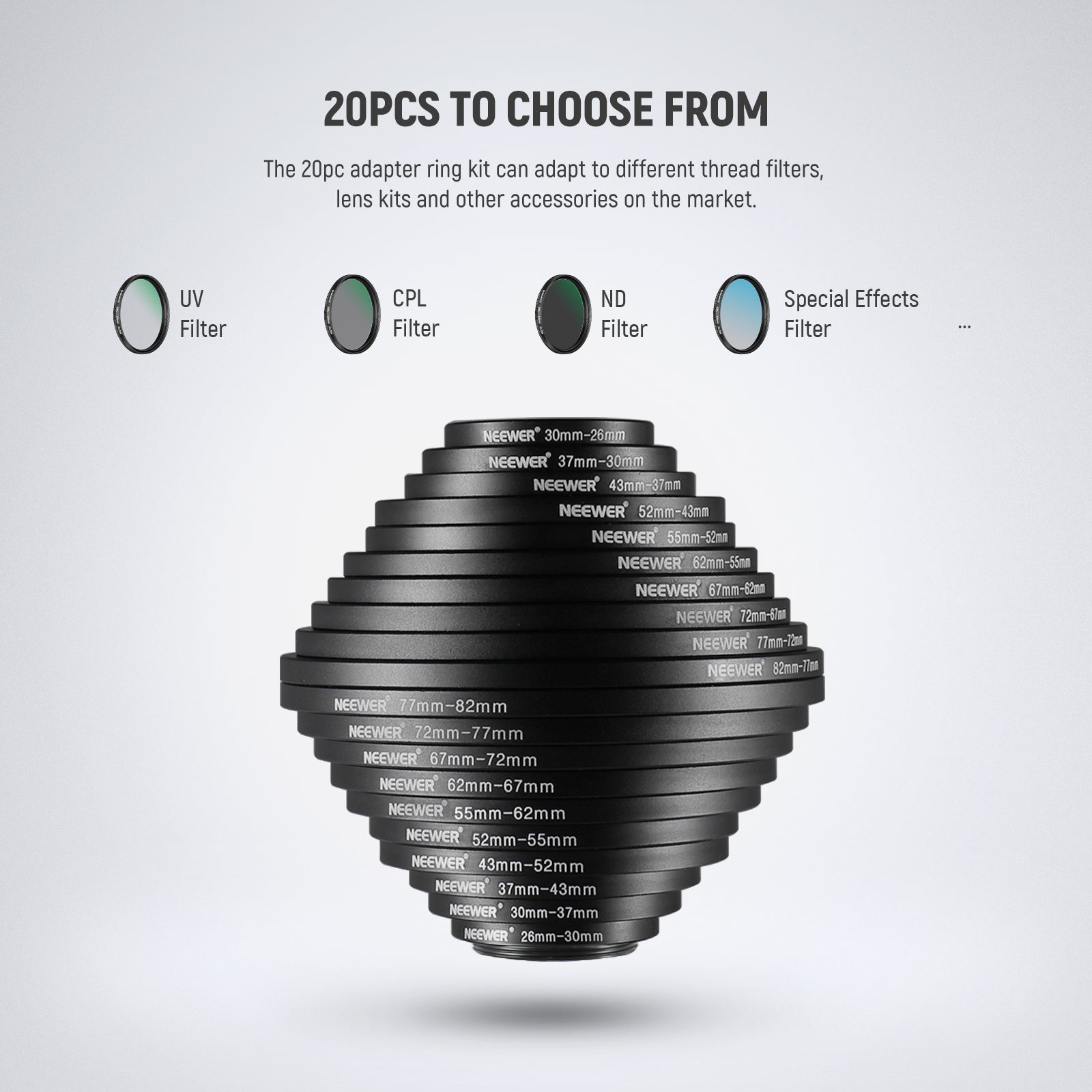 NEEWER 20 Pieces Anodized Black Metal Lens Filter Adapter Ring Kit