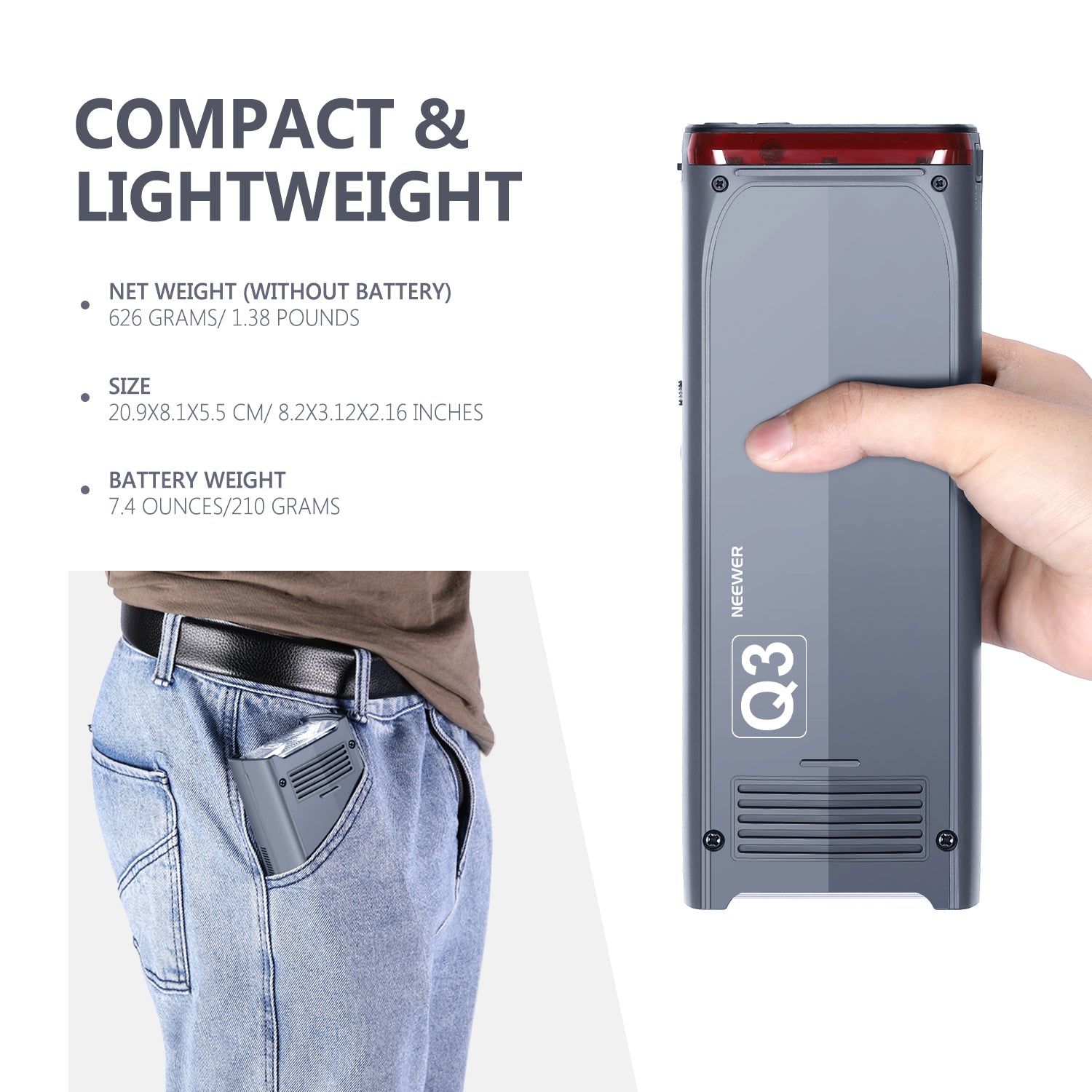 - PORTABLE FLASH SPEEDLITE: NEEWER Q3 provides the possibility of portable which means you could really take the flash speedlite in your pocket. The flash power is up to 200W. It is very portable for those who need to carry the flash everywhere they want and take photograph. That is why the Q3 is called "Pocket Flash"