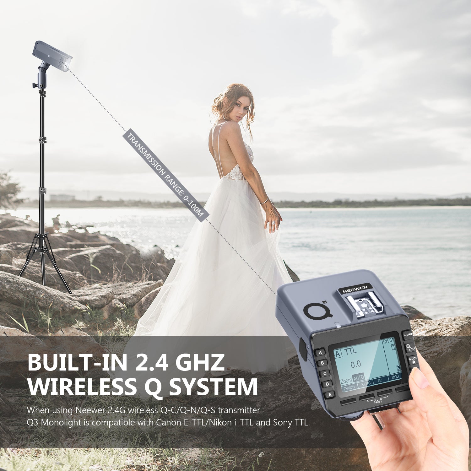 - 2.4G WIRELESS FLASH TRIGGER: When using 2.4G wireless Q-N trigger, Q3 Speedlite Monolight is compatible with Nikon TTL Cameras. Q-N TTL Wireless Flash Trigger has a total of 5 Groups and 32 Channels, support TTL Autoflash, 1/8000s High-Speed Sync, Multi Flash, Manual Flash, Flash Exposure Compensation, Group Modeling Lamp Control, Group Zooming, Adjusting All Groups' Output Value Simultaneously (Note: Battery Not Included)