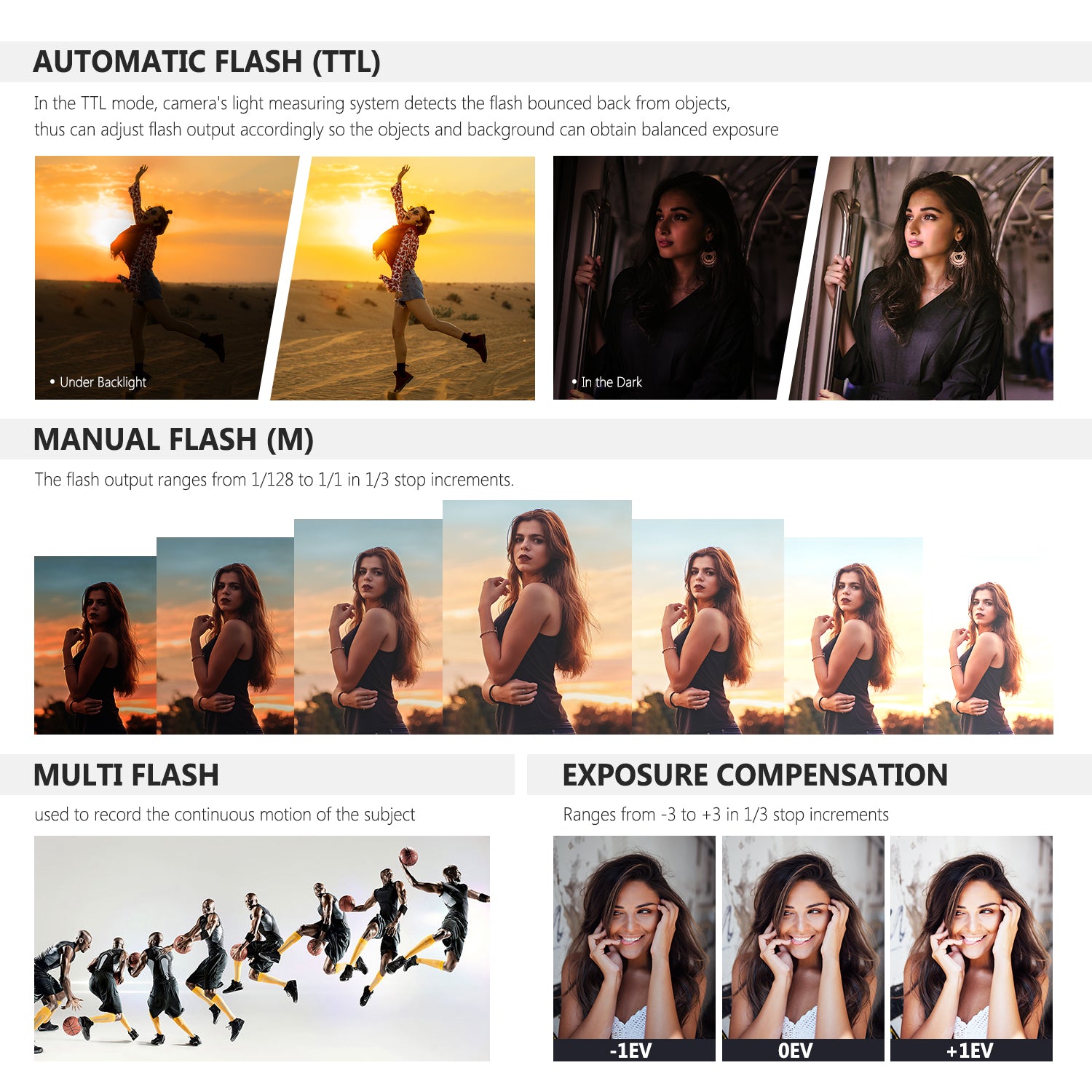 - Flash Modes: Wireless Off, TTL/M/MUTIL (Support Flash Exposure Compensation)