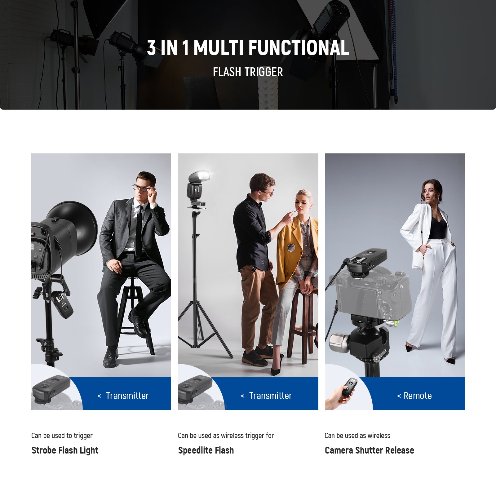 - 3 in 1 Multi Functional Flash Trigger- This remote flash transmitter can be used to trigger (1) the wireless synchronous studio strobe flashes, such as NEEWER S101-300W S101-400W S101-400W PRO Q300 flash; (2) It can be used as wireless trigger for speedlite flashes; (3) It can also be used as wireless camera shutter release