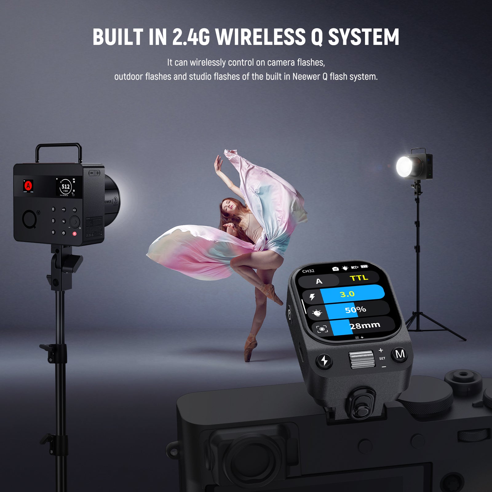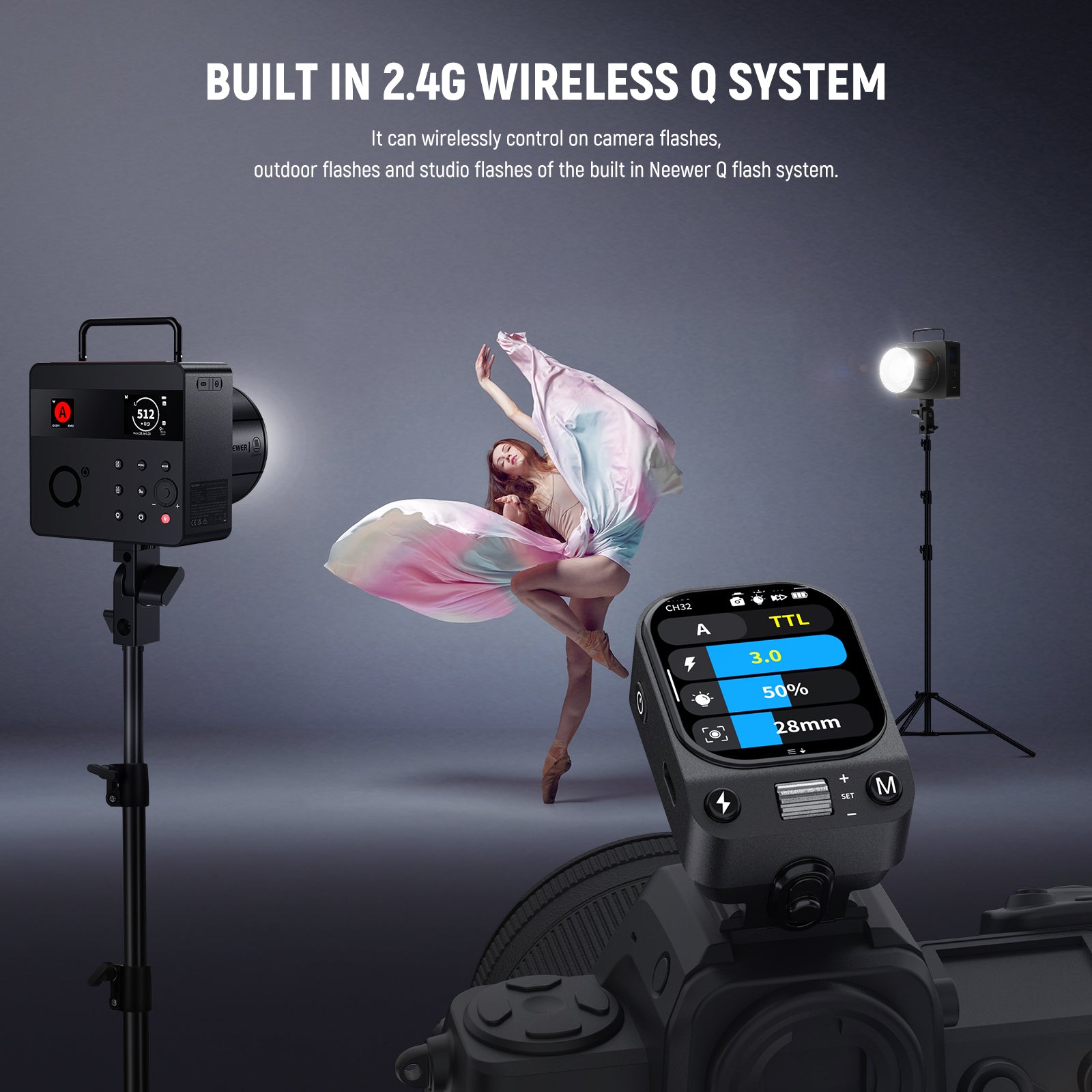 - Built In 2.4G Wireless Q System- Wirelessly trigger NEEWER NW420-C, Z1-C, Z2-C, Z760-C, Z880-C, NW760-C, Z2PRO-C, S102-400W Pro, NW655-C, and Q-C (only off camera triggering), or control other flashes without a Q system via a NEEWER QR receiver and a 2.5mm sync cord (all sold separately). Also with a channel scanning function to detect idle channels for less signal interference among 5 groups, 32 channels, and 01-99 IDs within 328'/100m