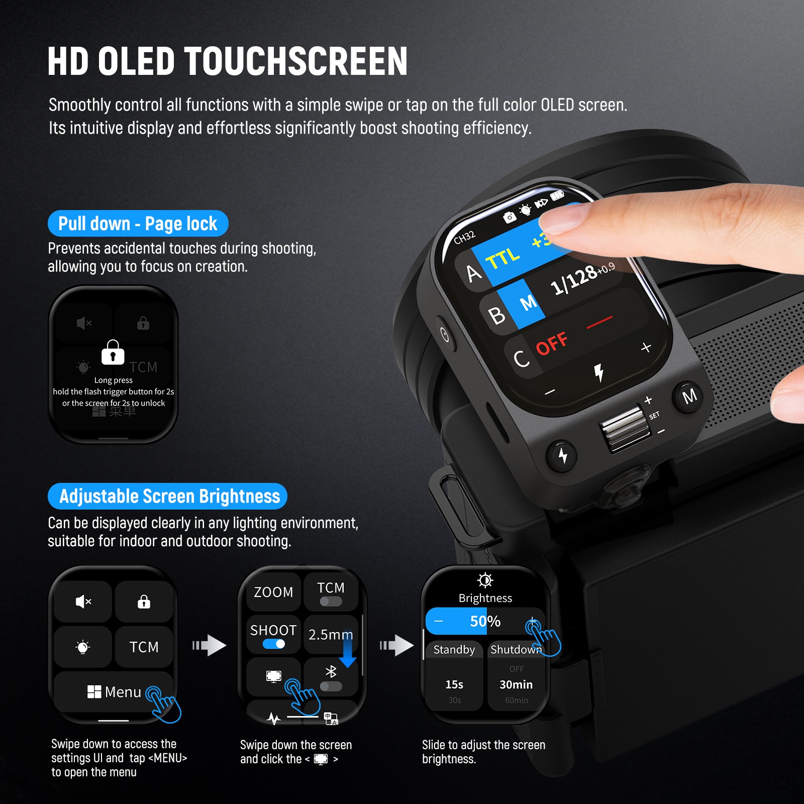 - Professional Flash Trigger with Touchscreen- The wireless flash trigger features an OLED touchscreen with adjustable brightness, and allows for button controls even with gloves in winter. Supports TTL automatic flash, 1/8000s high speed sync, flash exposure compensation (FEC), manual flash, one click TCM switch, stroboscopic flash, modeling lamp control, zooming, single point triggering, group control, etc. Note: Disable the single contact mode for TTL and Strobe modes