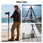 - 2 Axis Flexible Center Column- 1. The unique design of the center column consisting of 2 sections enables the maximum height of the tripod and monopod to be higher; 2. The center axis can be inverted for macro photography, or completely detached for low angle shooting; 3. Combine the center column and the legs as a regular camera tripod, and reverse the legs when stored. Includes a handy hook to hang sandbags (not included) for increased stability
