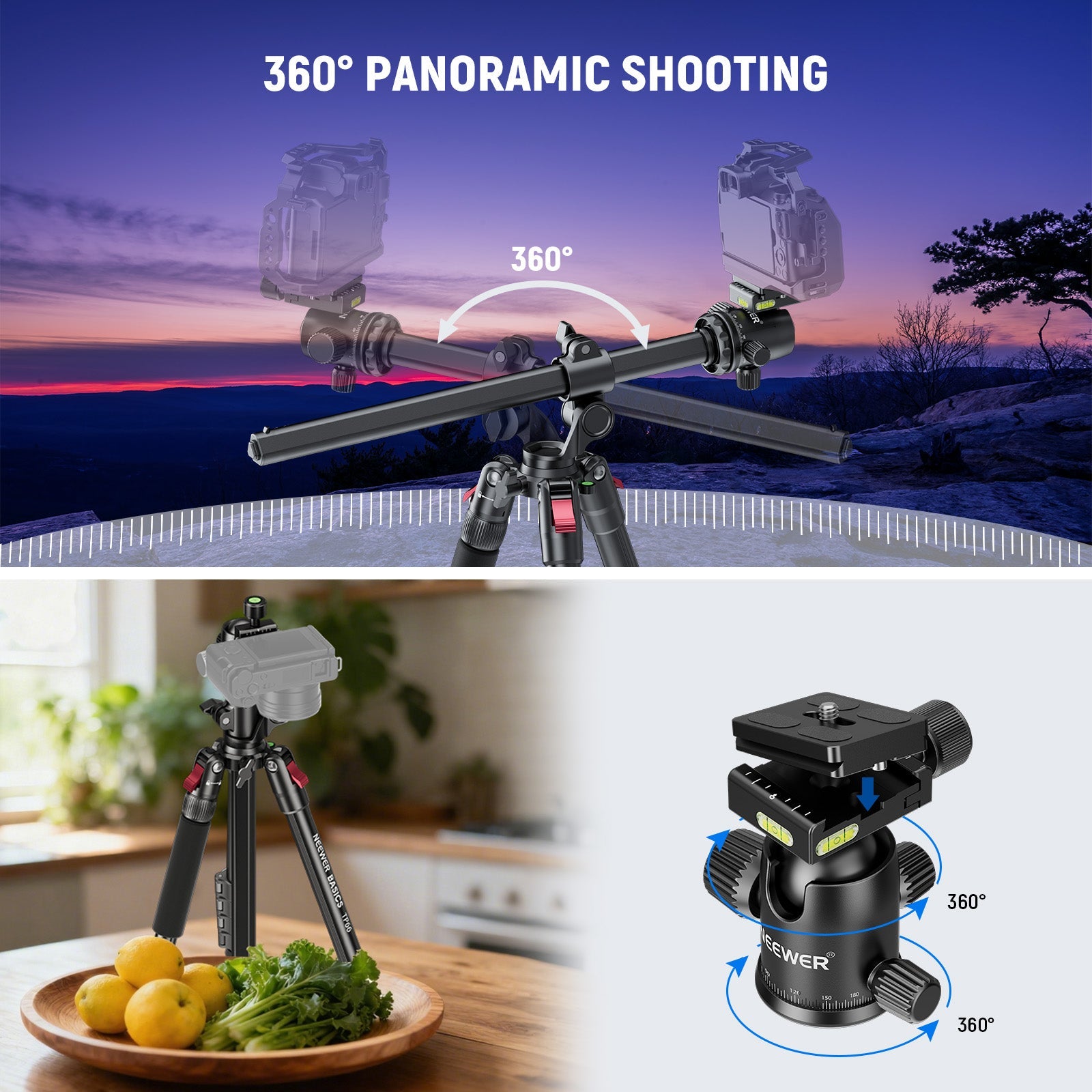 - Multi Angle Adjustments & Quick Release- The center column tilts 180° and rotates 360° via locking knobs, enabling fast transitions between horizontal, vertical, and angled positions for diverse shooting needs. This camera equipment can also be inverted for low angle or macro photography. The 360° ball head includes an Arca type quick release plate for swift mounting and dismounting