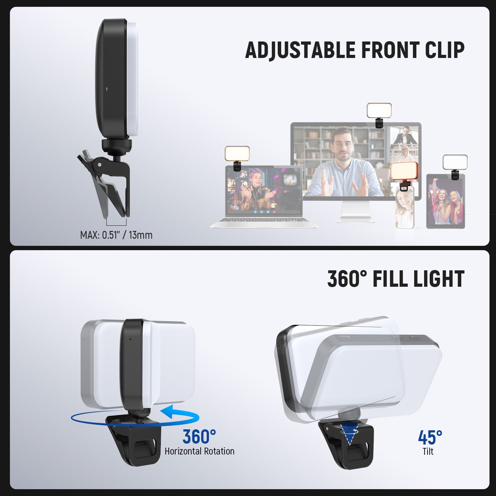 - Compact & Lightweight Phone Light- NEEWER N8 clip on overhead light is a premium soft fill light, compact at 3.3"x3.7"x0.7"/85x94x18mm, weighing only 1.94oz/55g. Mount onto a phone camera (compatible with iPhone), desk laptop, or desktop PC to flatter your skin and enhance your look in selfie pictures, vlogging recording, video conferencing, live streaming, Zoom calls, and more. The clamp features a ball head that enables 360< rotation and front to back tilting for versatile lighting angles