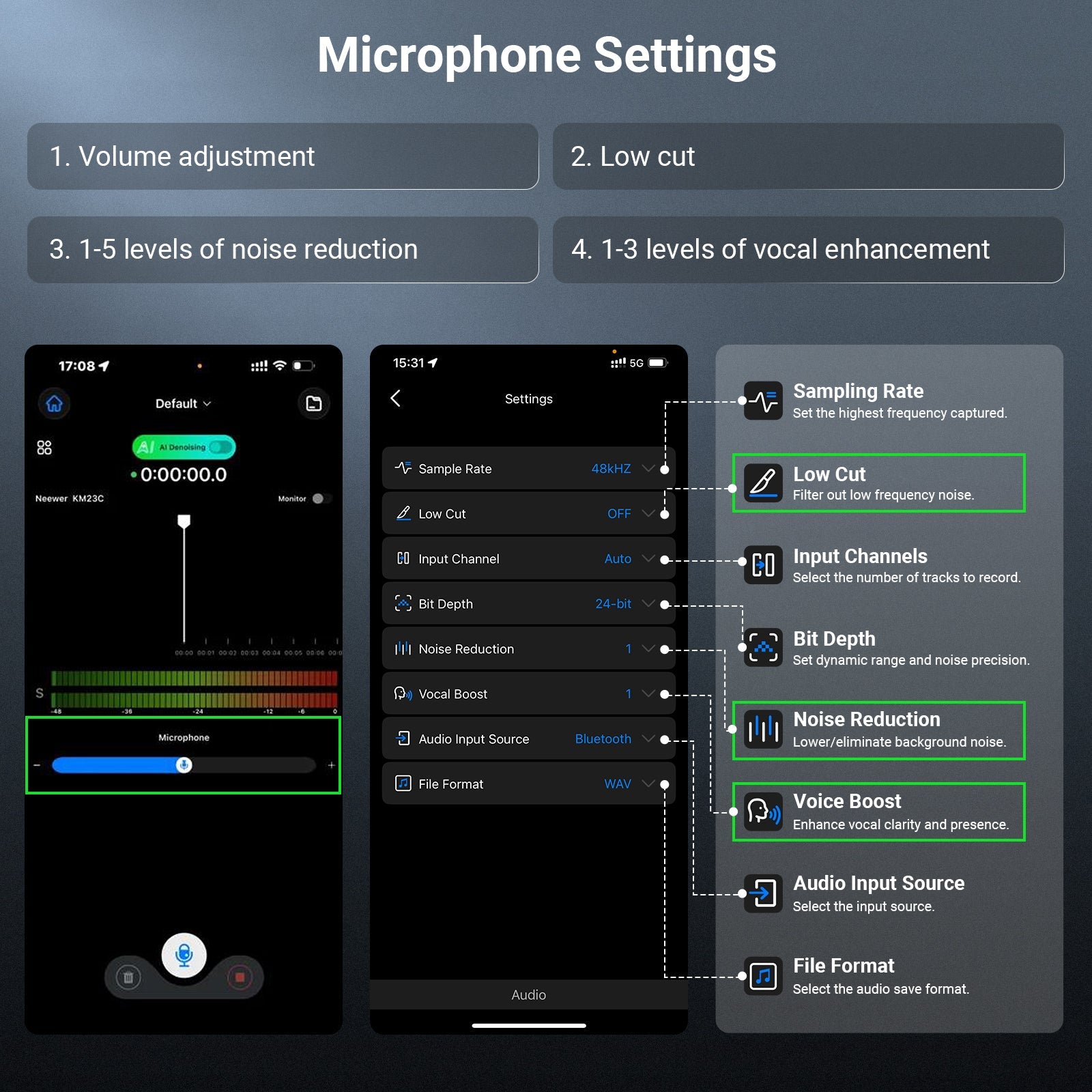- Clear AI Noise Cancellation- AI noise cancellation automatically identifies noise in a mixed audio signal and removes or masks it, while boosting vocals for a clearer, fuller, and purer output. Furry windshields eliminate wind noises in outdoor recording
