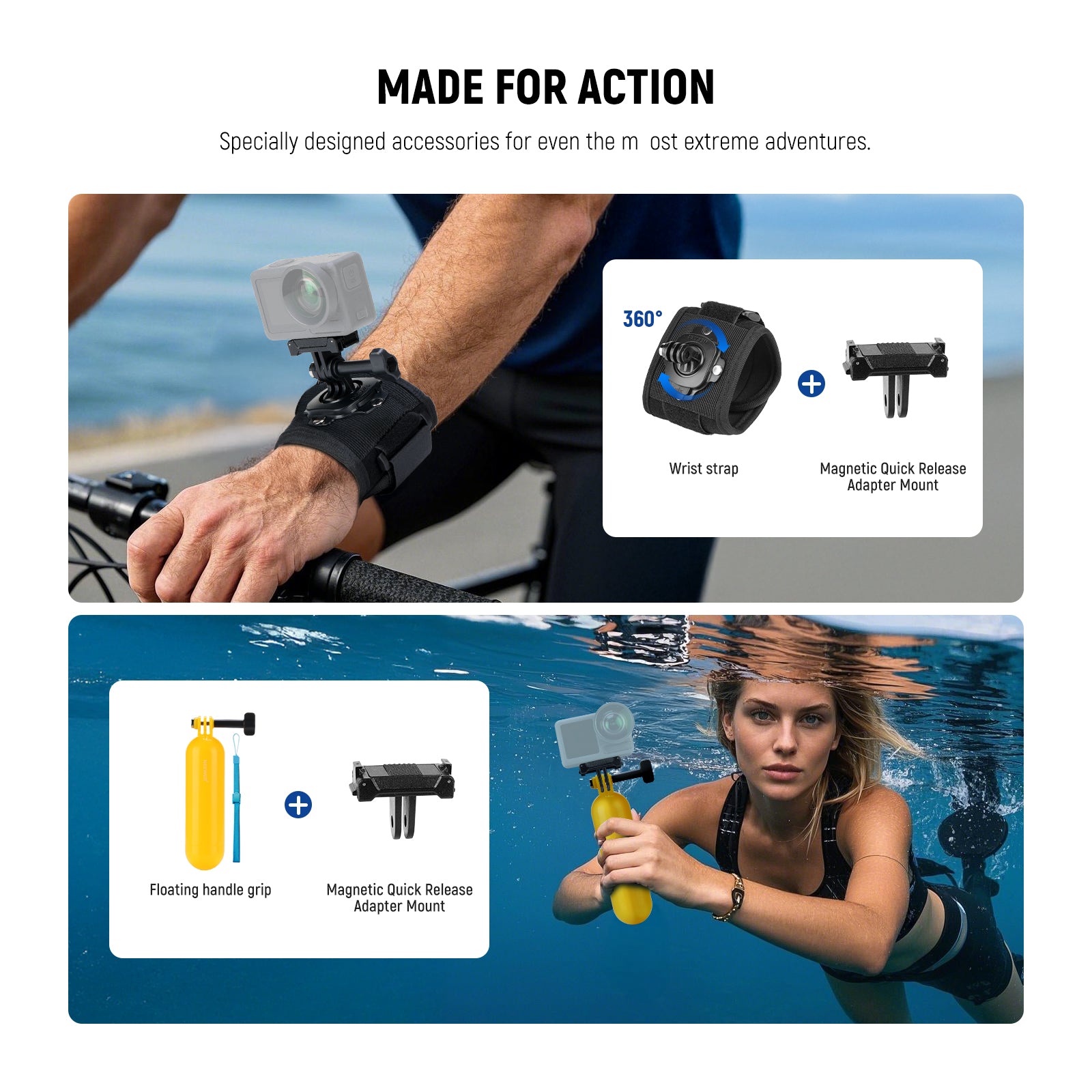 - Para deportes acuáticos : usa la empuñadura flotante impermeable y el soporte magnético de liberación rápida para buceo submarino y fotografía en aguas poco profundas. El mango flotante, compatible con el palo selfie GoPro, mantiene tu cámara a flote con estabilidad en el agua al nadar o hacer snorkel. Usa la base redonda, las almohadillas adhesivas, las hebillas de correa, las hebillas de gancho en J, el soporte de liberación rápida y los accesorios de cordón para sujetar la cámara de acción de forma segura a las tablas de surf, liberando tus manos y compartiendo una experiencia inmersiva.