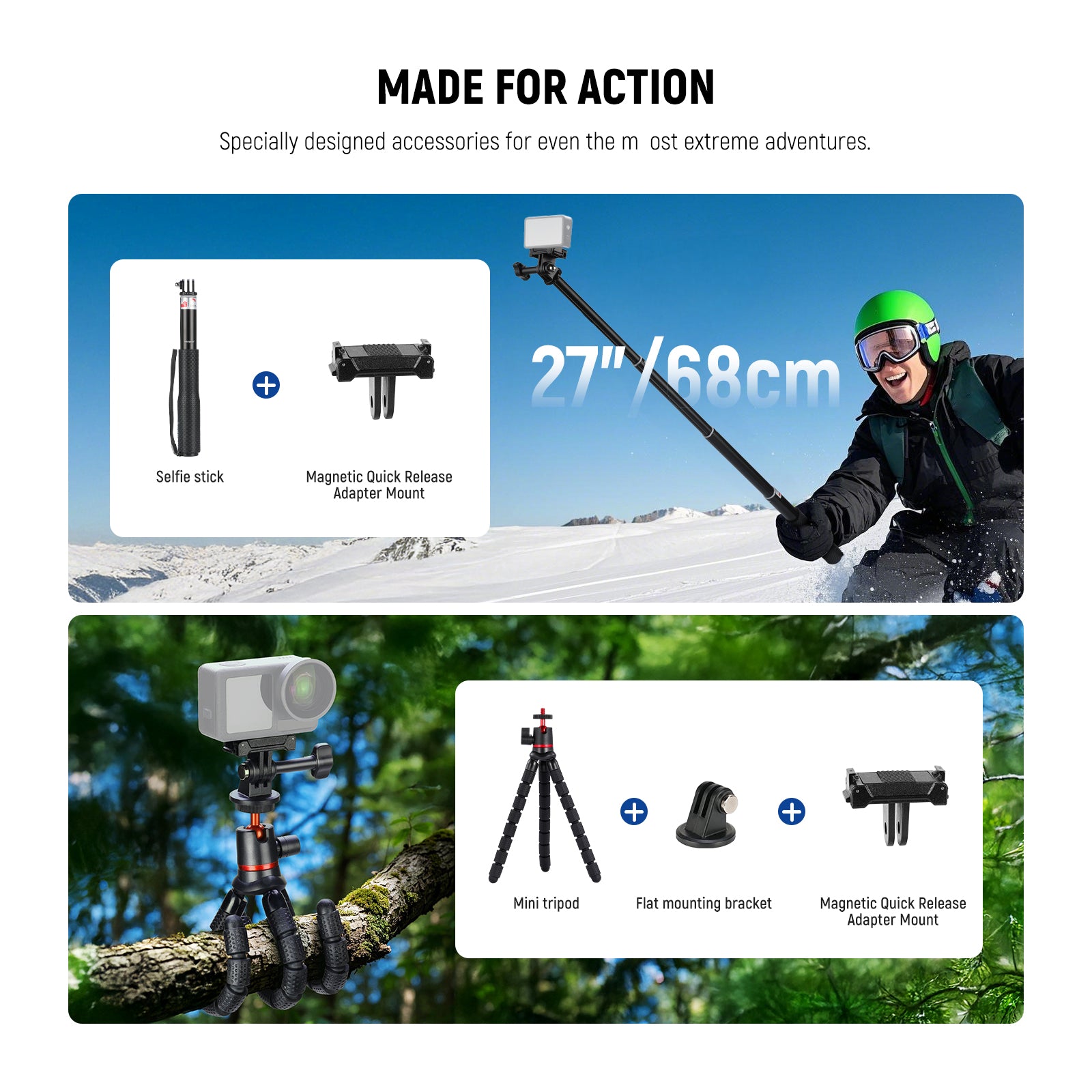 - Kit de esquí y adaptador de montaje para cámara de acción : captura imágenes impresionantes de tus deportes, como el snowboard, con el palo selfie y la correa para la cabeza. El palo selfie se extiende hasta 68 cm, mientras que la correa para la cabeza sujeta la cámara a la cabeza o al sombrero para capturar fotos en primera persona de surf, skate, paracaidismo y puenting. El paquete de accesorios incluye adaptadores compatibles con GoPro Hero 13, 12, 11, 10, 9, 8 y 7 Black, Go Pro Max, DJI Osmo Pocket 3, Insta360 X4, X3, Insta 360 Ace Pro o soporte para iPhone.
