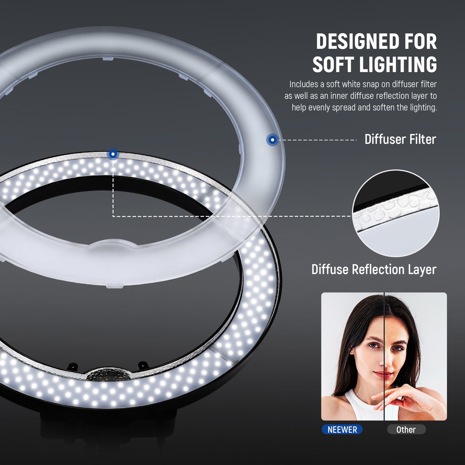 • Our engineers have spent years perfecting the lighting effect and continually update it based on feedback and suggestions that 2 reflective silver layers are embedded around the LED beads in the outer and inner ringside, which is unique for the Neewer ring light. With this design, the light will be also bright even in the lowest brightness and softer.