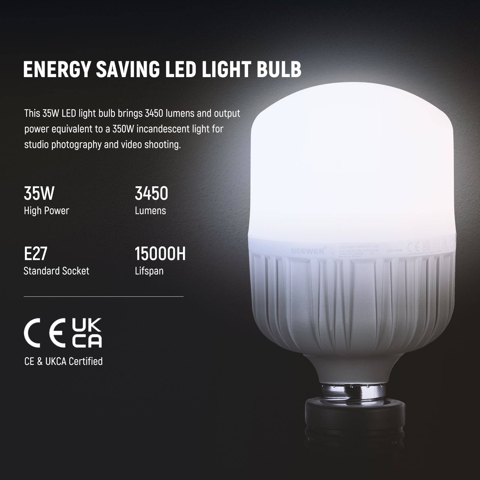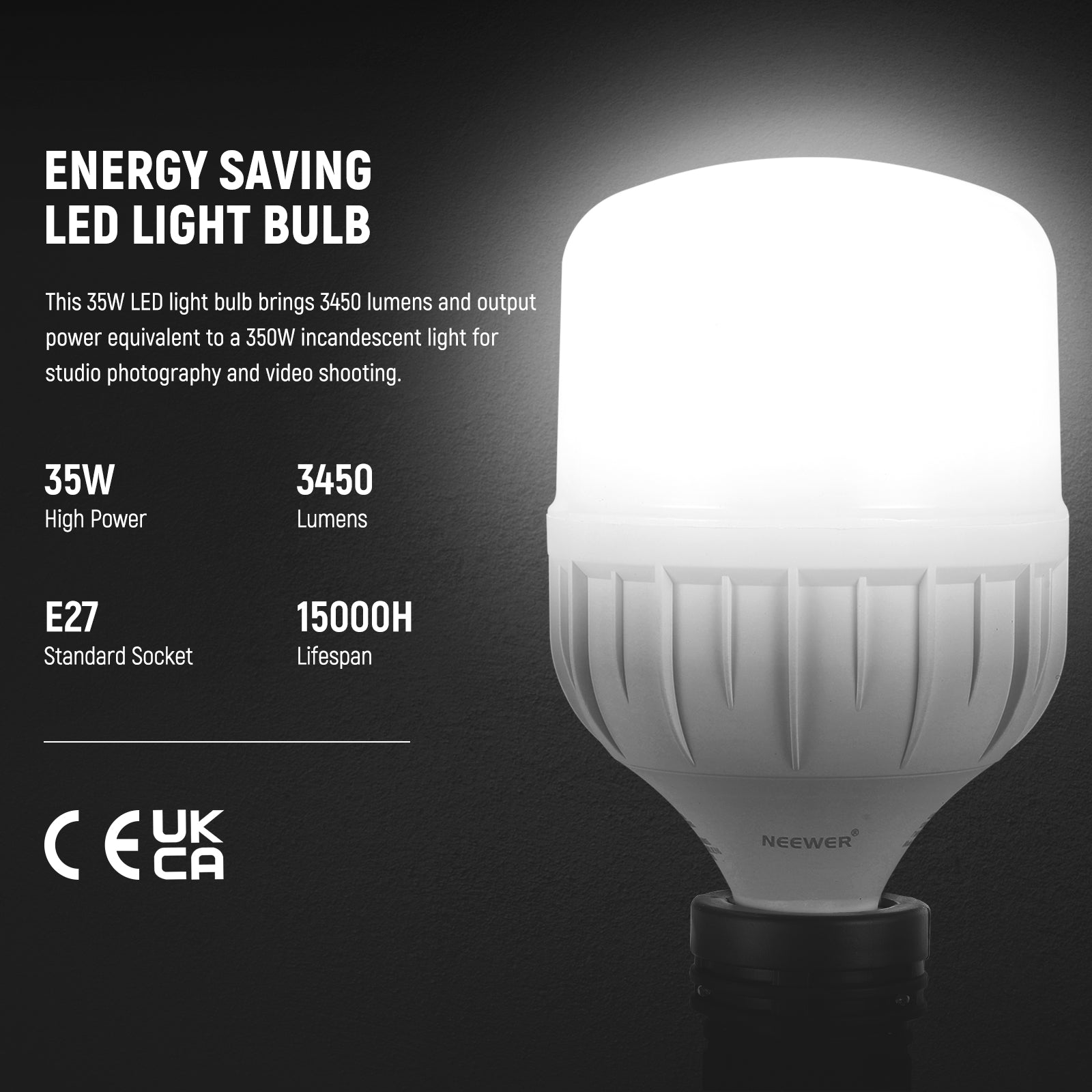 - 35W 5700K LED Light Bulb: This UL certified 35W LED light bulb has a power output equivalent to a 350W incandescent light and brings 3450 lumens for studio photography and video shooting. Screw it into a standard E27 socket for bright and constant illumination free from flickers