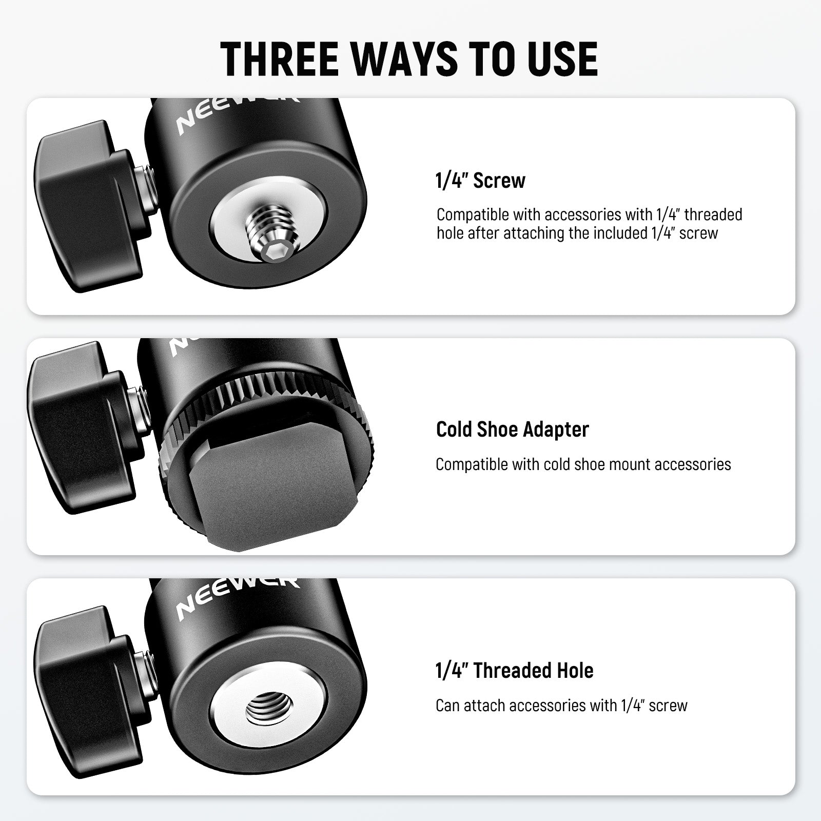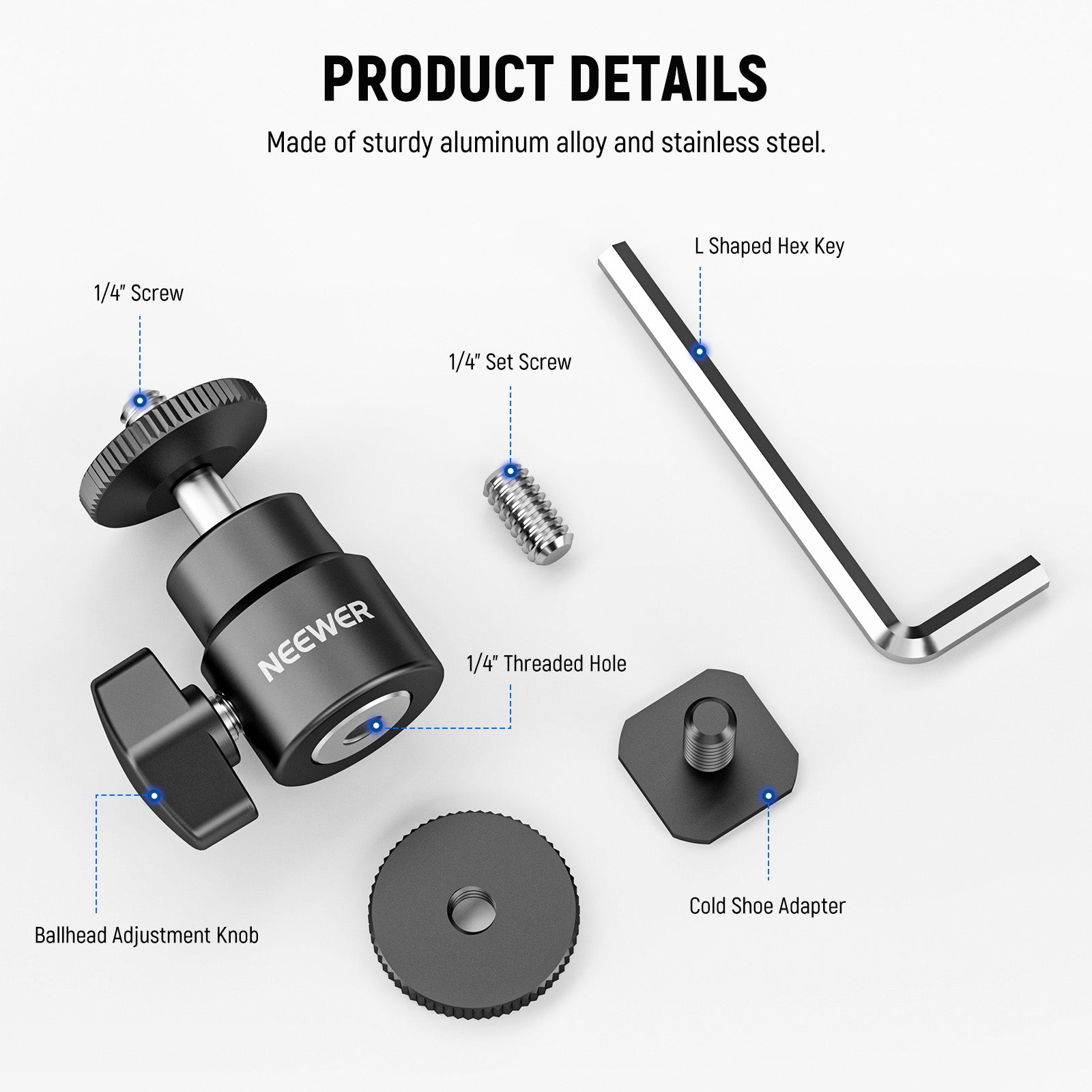 - Mini Ball Head. Securely mount your camera via the bottom cold shoe adapter. The top 1/4” screw allows you to mount a wide range of devices, such as LED fill light, LED flash, field monitor, and other accessories with a 1/4” threaded hole.