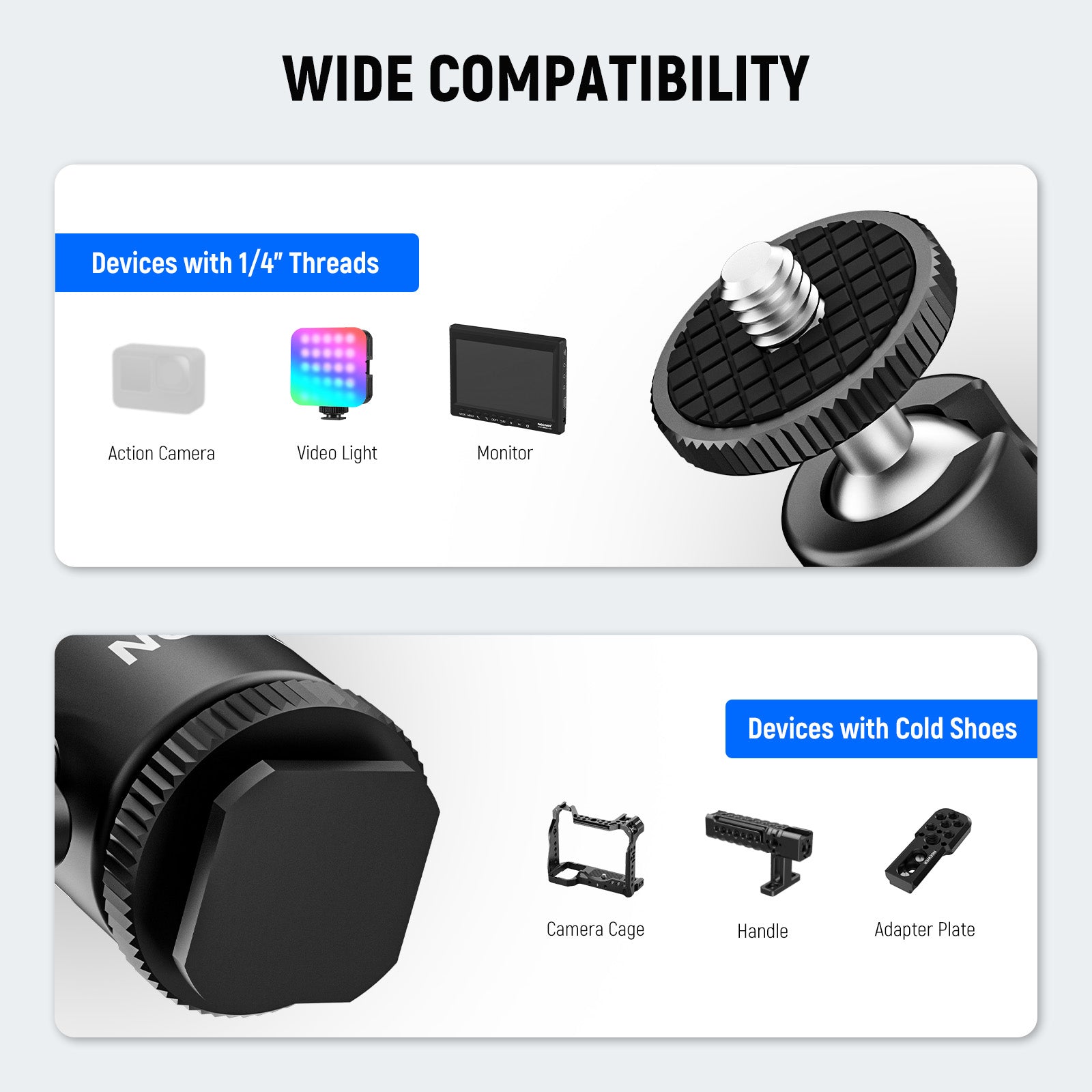 - Flexible Positioning. Easily adjust the ball head and tilt or swivel your LED fill light or field monitor with the adjustment knob.