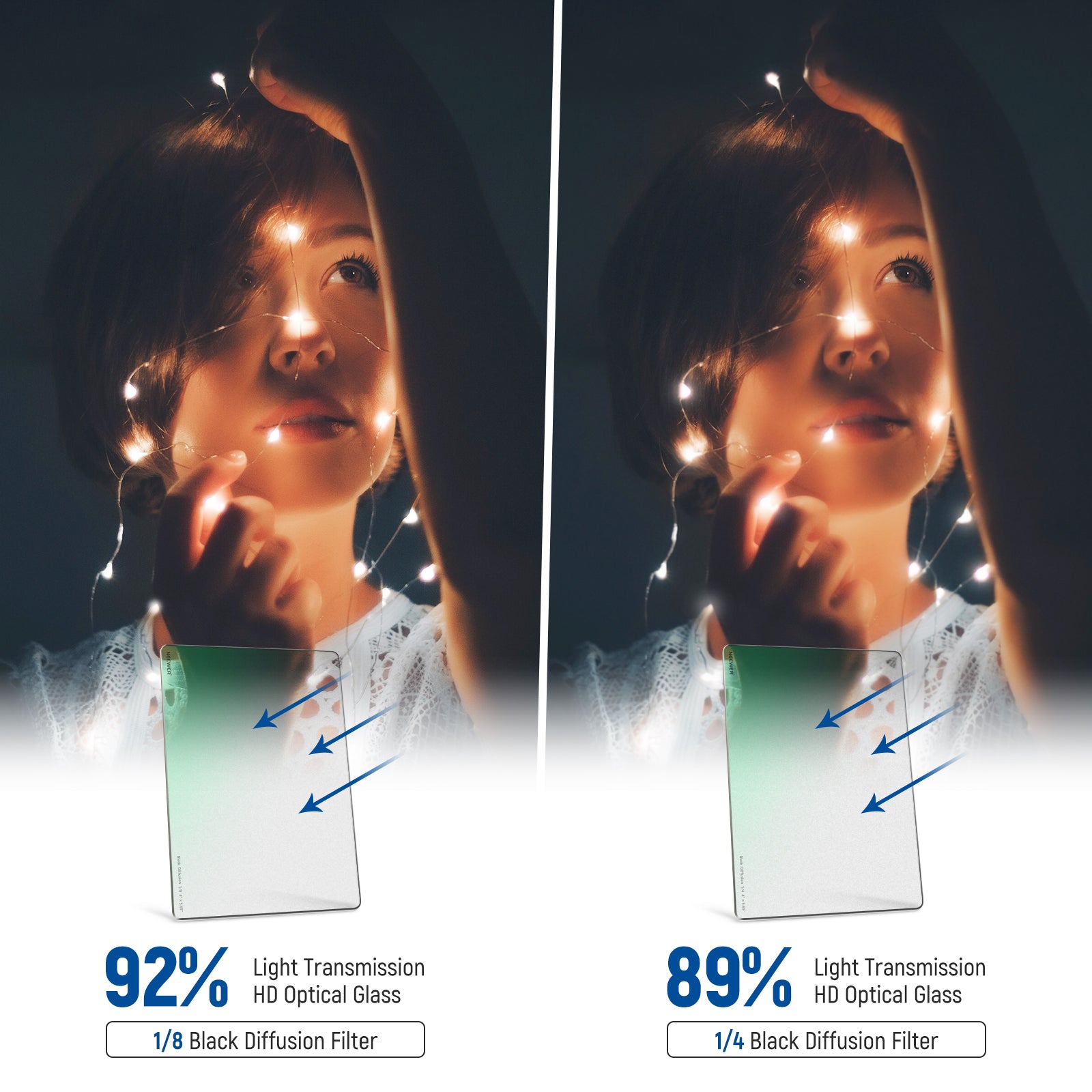 - 1/8 Black Diffusion Filter for Cinematic Effect- The 1/8 stop black diffusion filter effectively reduces highlights and lowers glare to deliver smoother and softer skin tone for dreamy cinematic effect on video and photo image. Ideal for portrait photography, video recording, and vlogging