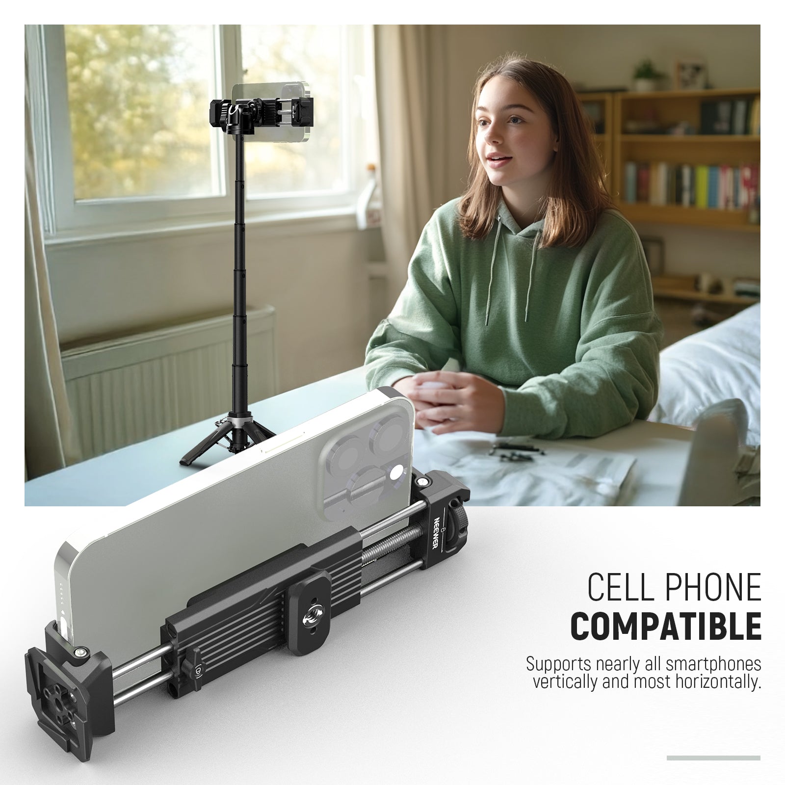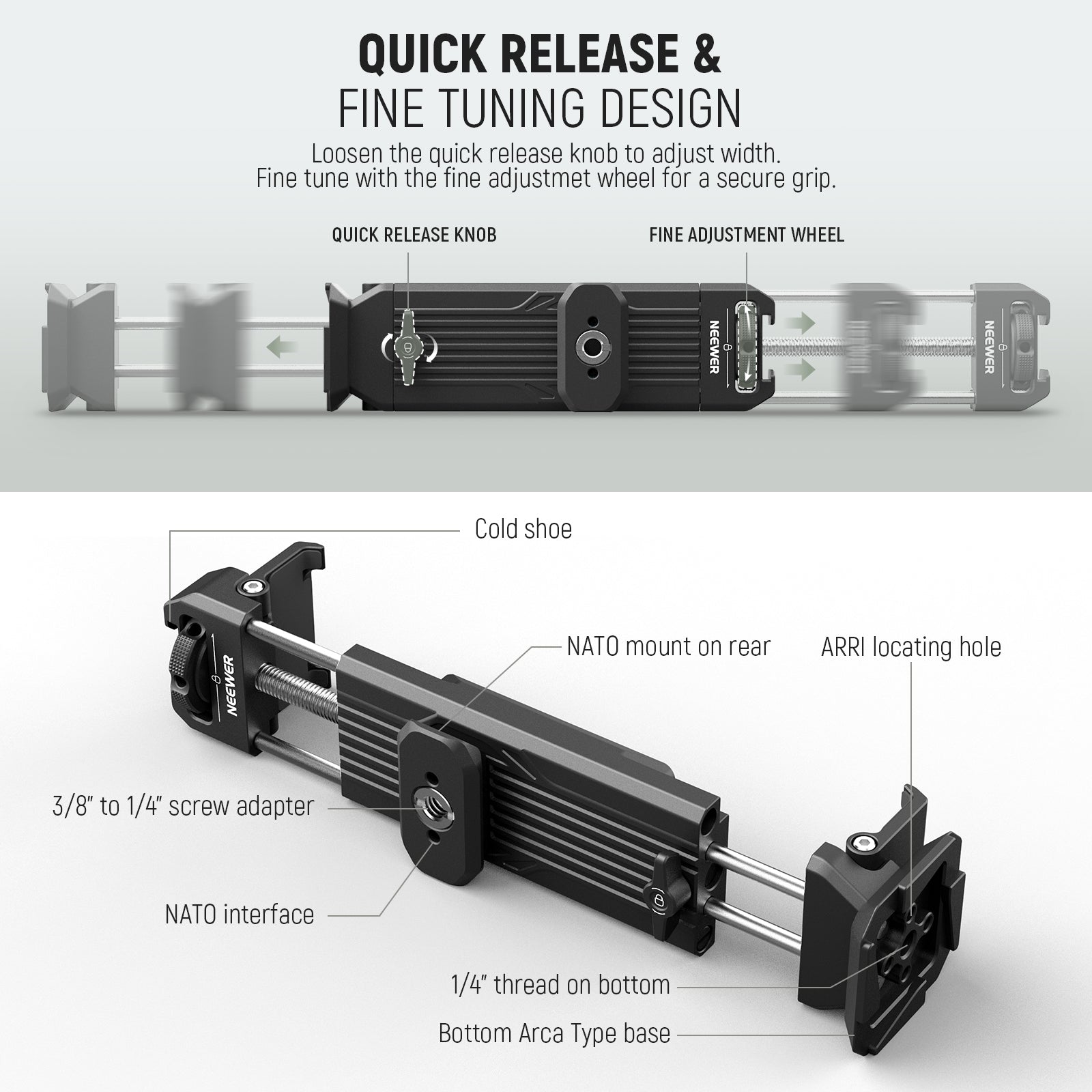 - Dual Mounting Options- Besides the 1/4" threaded ball head, you can also use the provided 1/4" male to 1/4" female screw adapter to mount your device in a fixed vertical position, including ring light, phone (phone holder not included), LED light panel, etc