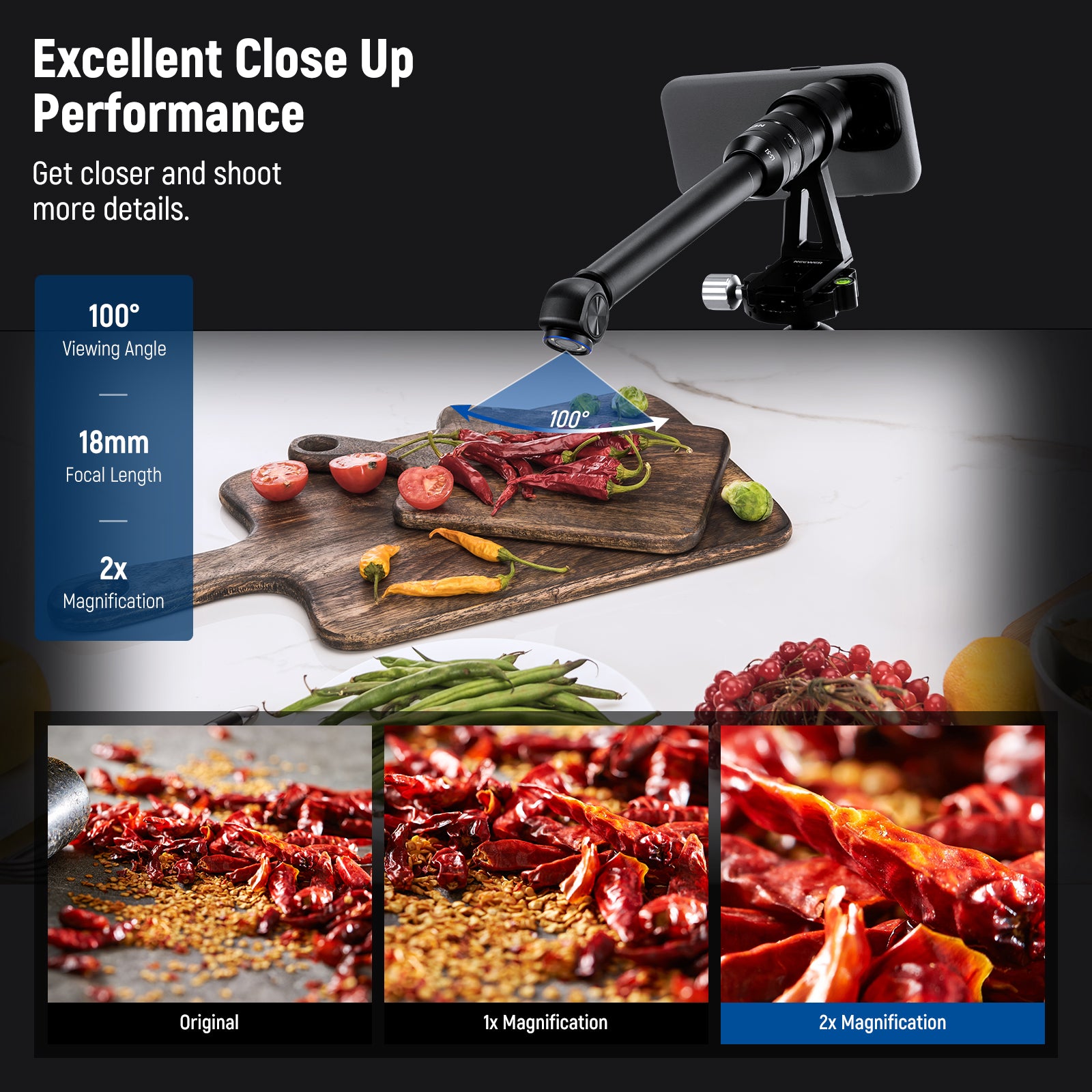 - 2x Magnification & Wider 100° Field of View- Featuring a terrific 2x magnification for close up shooting, this macro phone lens allows you to catch stunning details of the subject, ideal for photographing miniature models, food, animals, etc. Combined with the 100° larger field of view, it allows you to include a larger area or more subjects in your frames when getting detailed macro shots