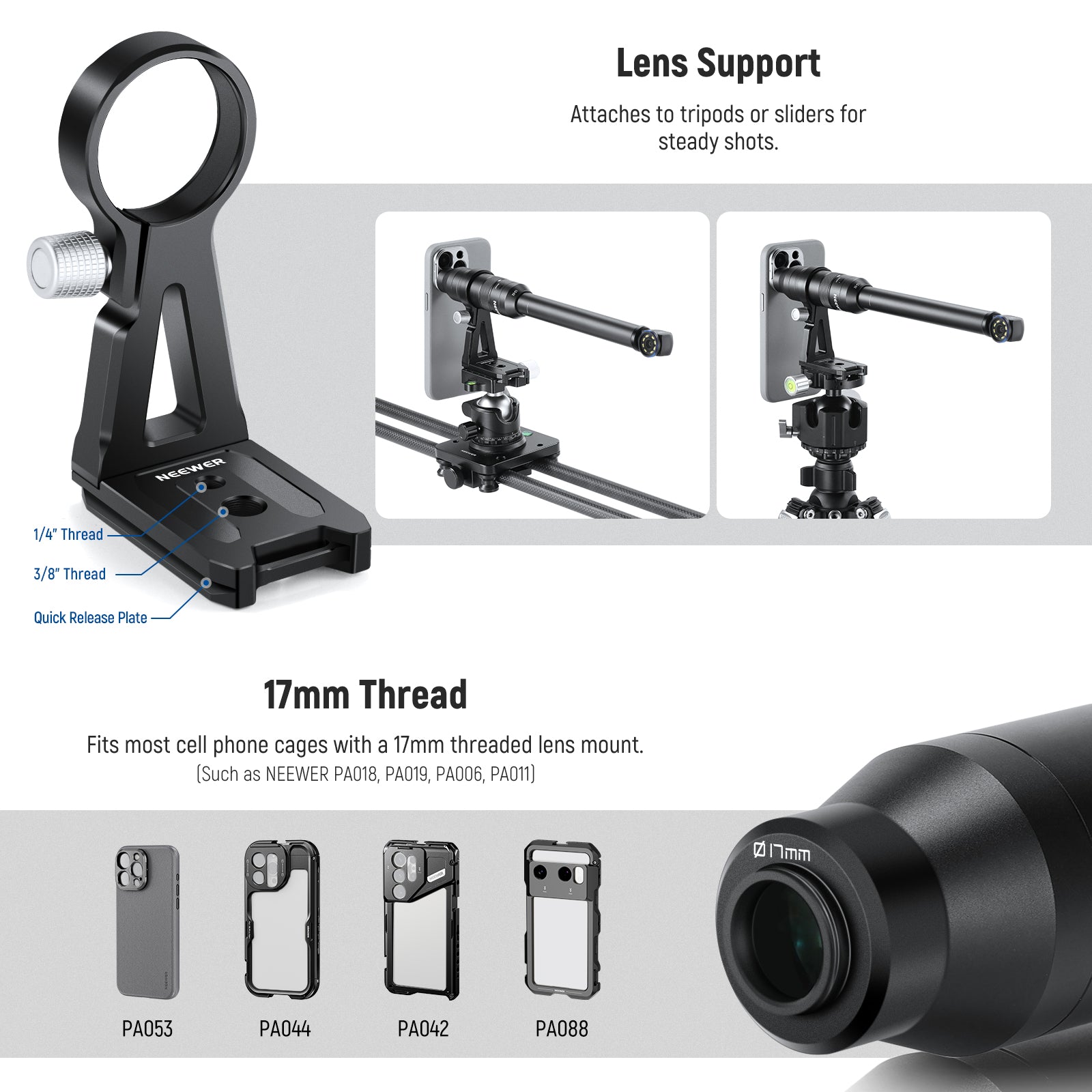 - Versatile Lens Support Bracket- Includes a phone lens support bracket with an Arca style base, a 1/4" threaded hole, and a 3/8" threaded hole for enhanced compatibility. It allows you to connect the phone lens to a rail or tripod for more stable and creative use
