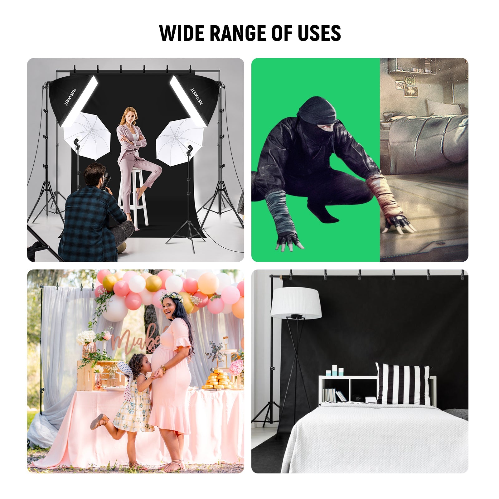 - Versatile Background Kit- Consists of 1 x (6x9ft/1.8x2.8m) polyester backdrop (black, white, and green), 6 x backdrop clamp, and 1 x (8.5x10ft/2.6x3m) background support system, ideal for television, video production and digital photography. The 2 carrying bags are great for transporting light stands, umbrellas, and other accessories.