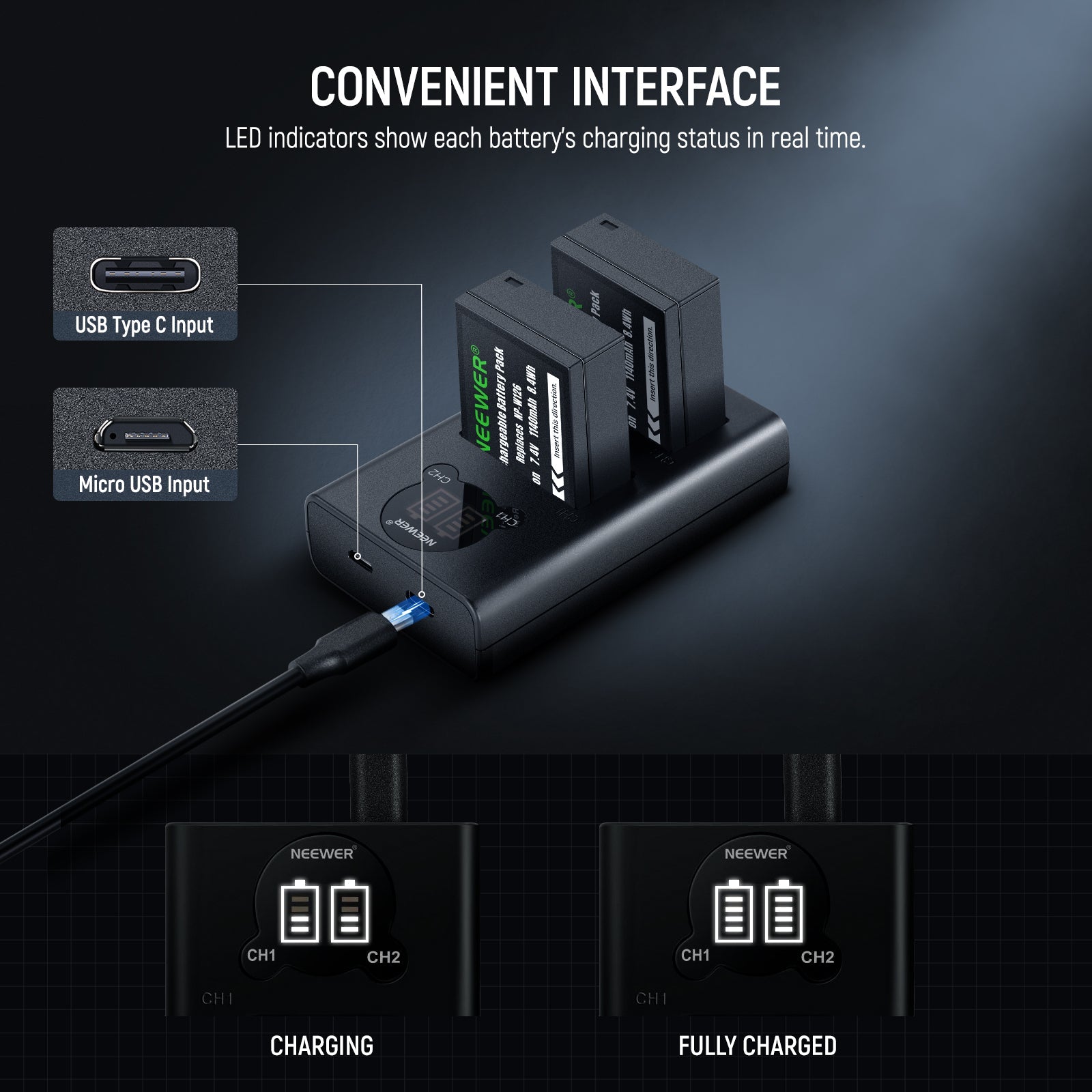 NEEWER 2 Pack 1140mAh NP-W126 Replacement Battery Charger