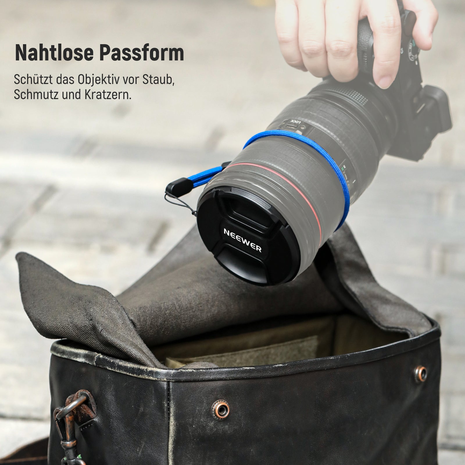 - Safe Anti Loss Strap- Tie the anti loss strap to the eyelet located on the side of the lens cap to prevent dropping and missing