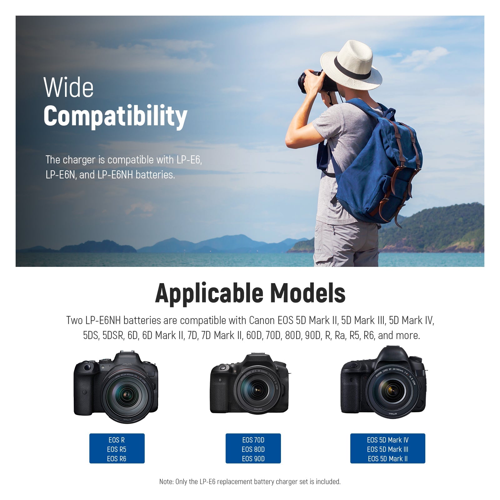 - Wide Compatibility- Two LP-E6NH batteries are compatible with Canon EOS 5D Mark II, 5D Mark III, 5D Mark IV, 5DS, 5DSR, 6D, 6D Mark II, 7D, 7D Mark II, 60D, 70D, 80D, 90D, R, Ra, R5, R6, R7 and more. The charger is compatible with LP-E6, LP-E6N, and LP-E6NH batteries
