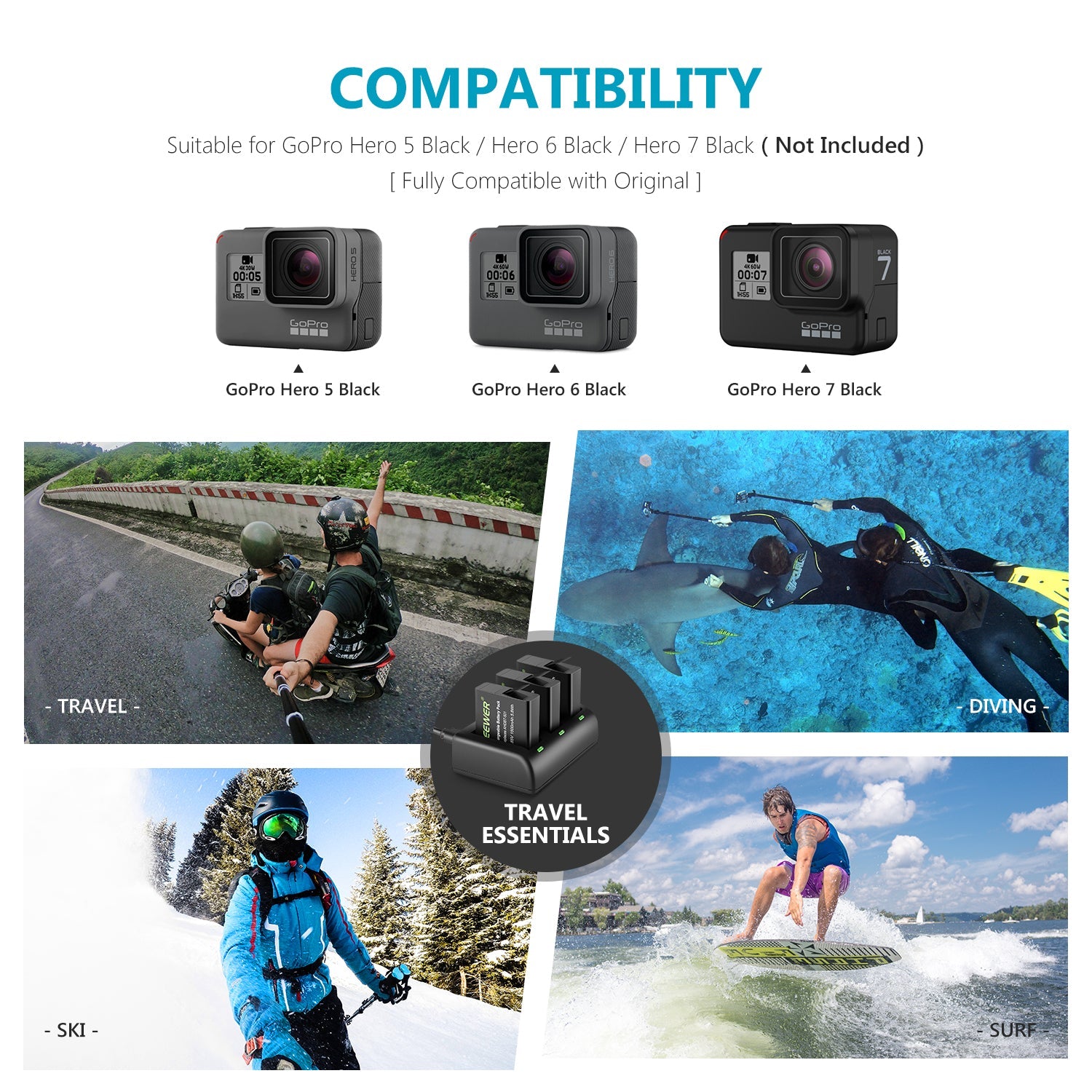 - EXACTLY LIKE THE ORIGINAL: Compatible with GoPro Hero 5/6/7 Black, GoPro Hero 2018 camera, But the bigger capacity of 1500mAh Battery, can charge inside the camera, or using the USB input charger to maximize charging efficiency; No memory effect so that you can charge the battery at any time - Super Long Time Recording