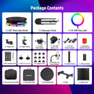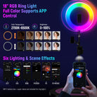 - 18" RGB Ring Light- The NEEWER RGB18 (II) features excellent 360° full-color light with 180° adjustable tilt. It offers six dimming modes, including CCT/HSI/RGB/Picker/FX/FX Music, and supports preset scene light effects that sync with the music. With an adjustable color temperature range of 2500K to 10000K and a high CRI97+, it is perfect for multi-person fill light needs. Bluetooth remote control via the NEEWER app enhances its usability