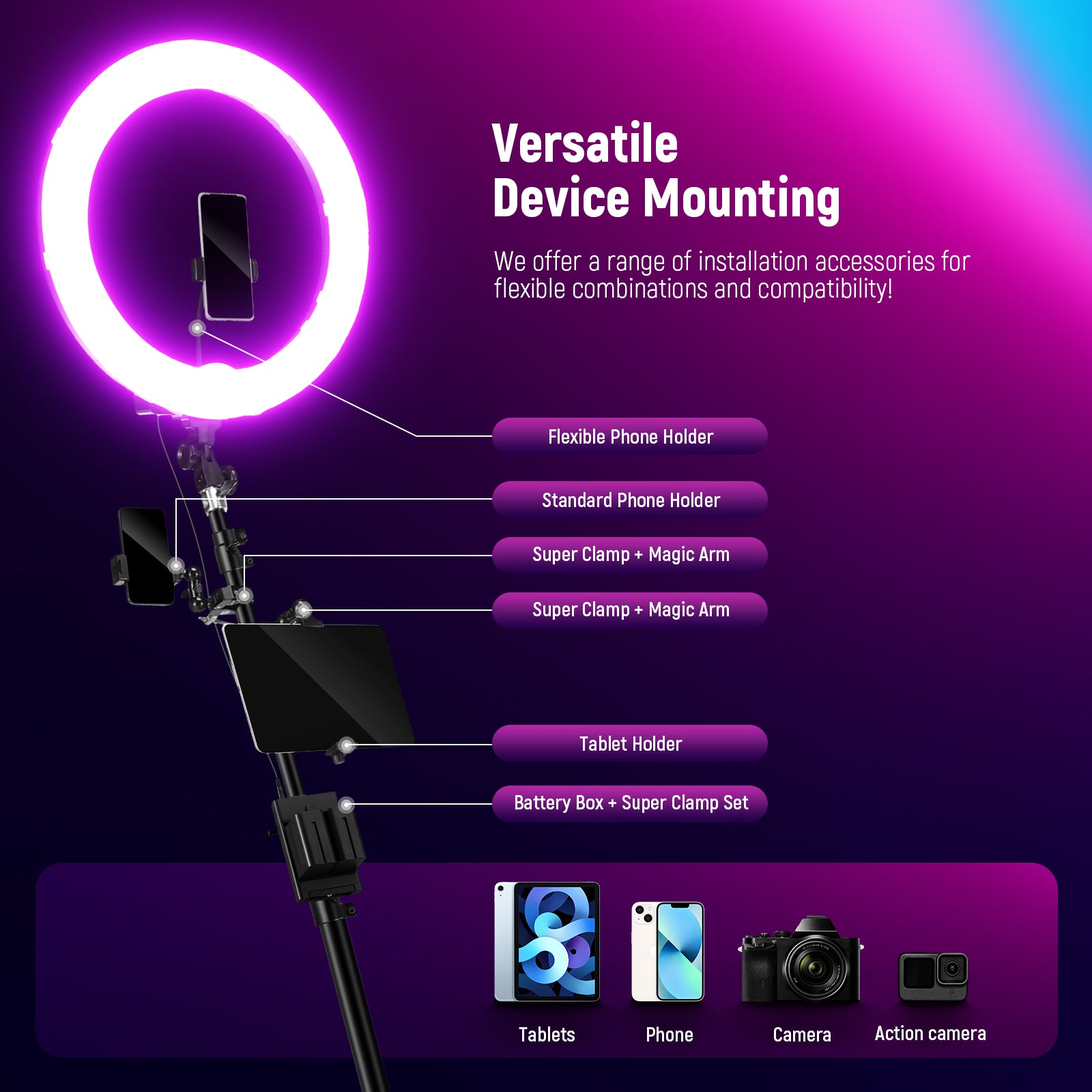 - Flexible Height & Multi Device Mounting- The light stand's height is adjustable in three sections (24.4”-78.7”/62-200cm) and allows for front and back angle adjustments. Paired with the ring light's 180° tilt, achieves effortless multiple-angle shooting. Use accessories like the included phone/tablet holders and super clamps for simultaneous multiple devices recording during short videos, live streaming, and content creation