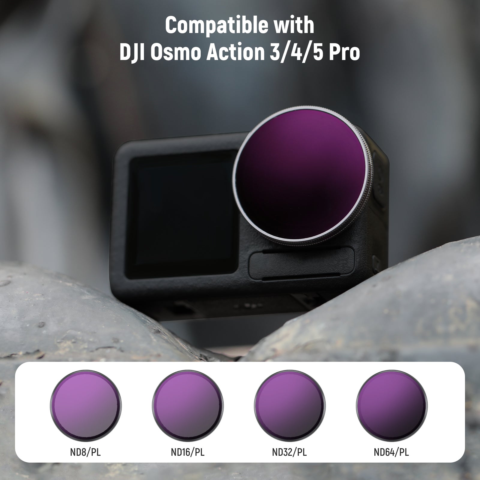 - For Action 5 Pro/Action 4/Action 3- This filter kit compatible with DJI Osmo Action 5 Pro, Action 4, and Action 3. Ideal for POV shots of surfing, kayaking, skiing, mountain biking, skydiving, skateboarding, and hiking. Note: While the filters feature waterproof coatings, the entire action camera should not be used underwater