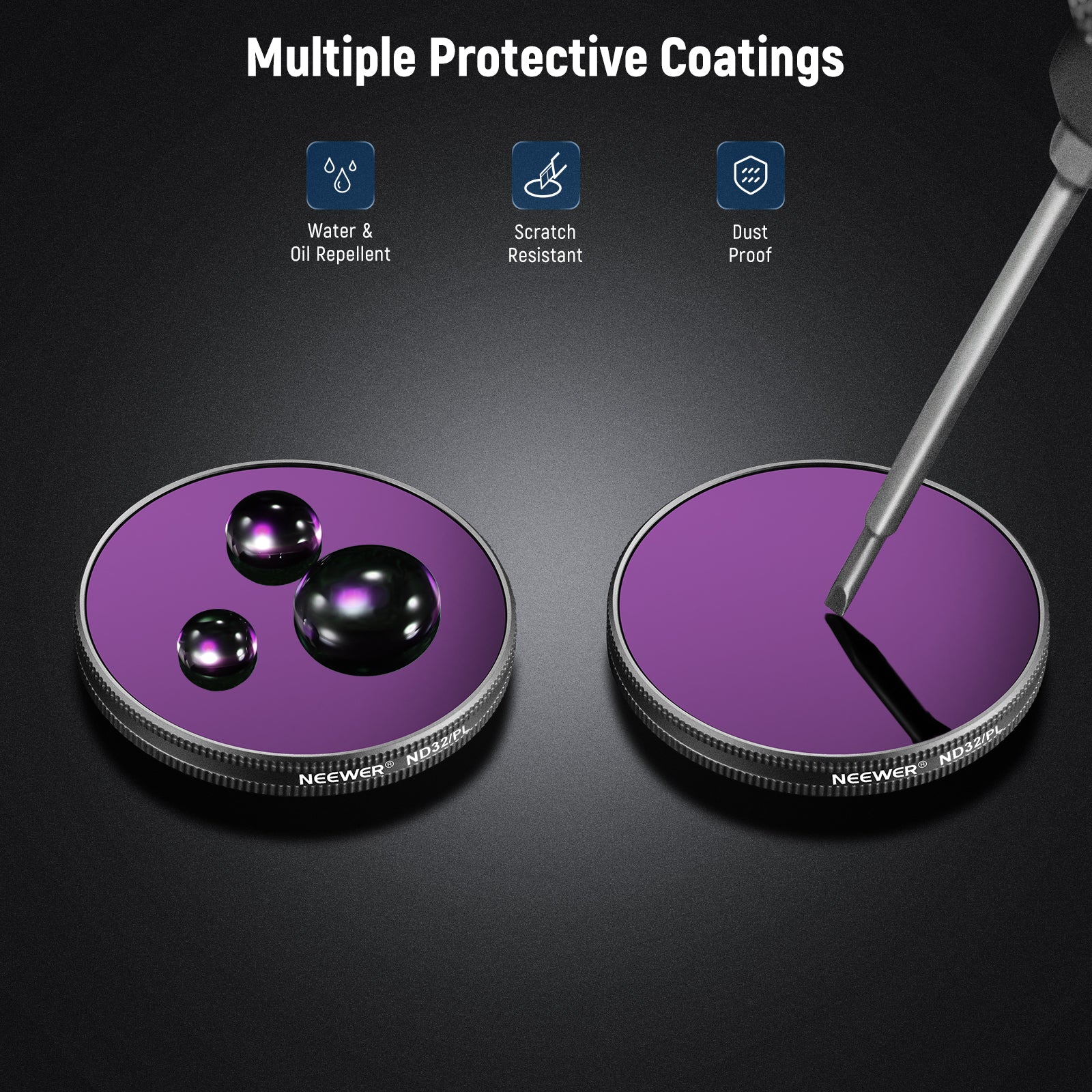 - Precise Exposure Control- ND8, ND16, ND32, ND64, and ND1000 filters reduce light by 3, 4, 5, 6, and 10 stops respectively. They offer precise exposure control in different light conditions, prevent overexposure in long exposure photography, and bring dynamic motion blur effects