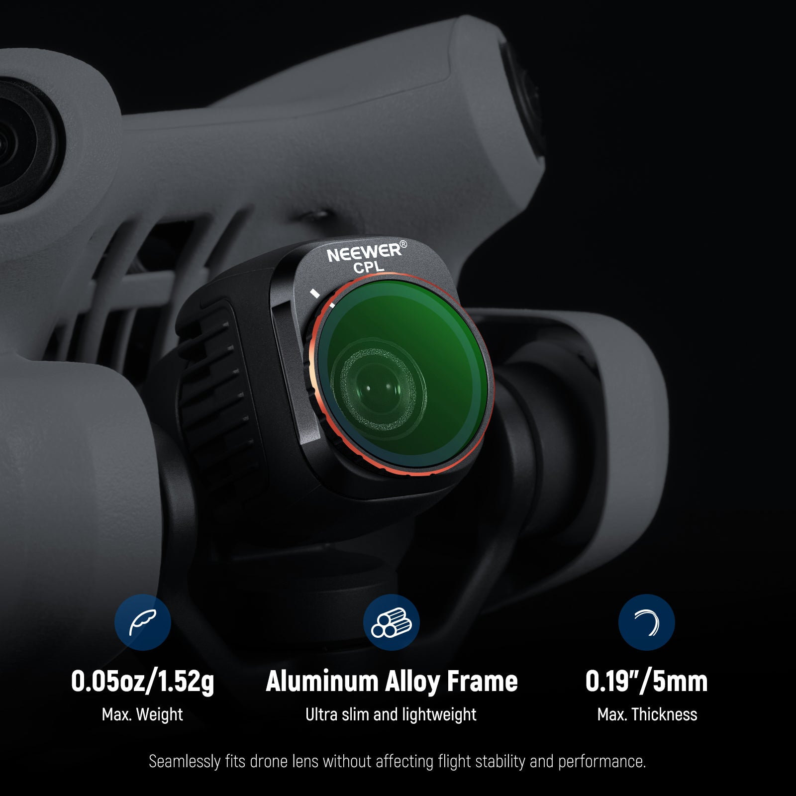 - Dedicated to Mini 4 Pro Drone Lens- Precisely CNC machined to be exclusively compatible with the DJI Mini 4 Pro. This ND & CPL filter kit is a game changer for all drone enthusiasts seeking to fine tune shutter speeds, reduce flare, enhance color, and achieve perfect exposure in different weather conditions. Made of aircraft level aluminum alloy, the lightweight 0.11oz/3.2g filters won't interfere with drone calibration and balance