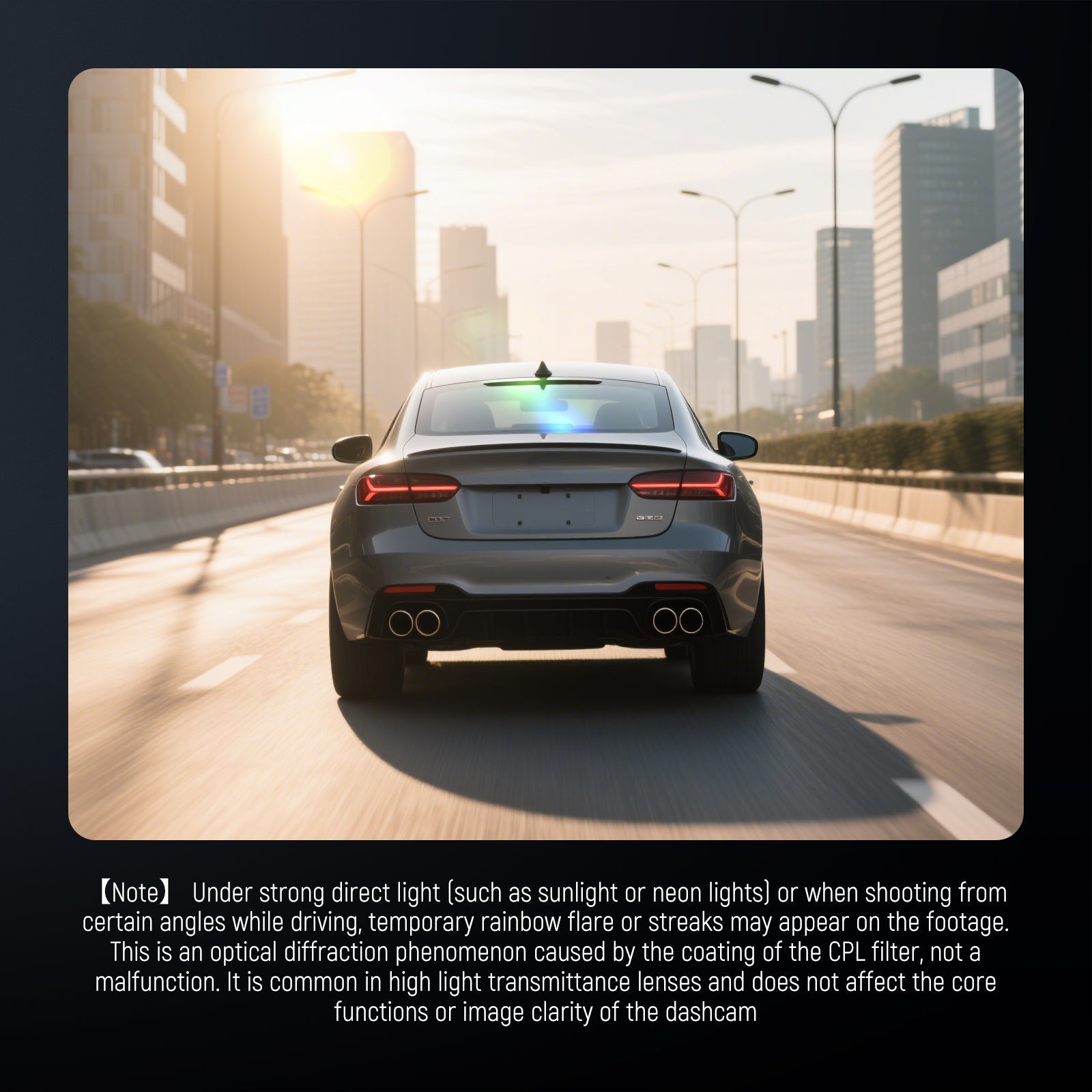 - Note- Under strong direct light (such as sunlight or neon lights) or when shooting from certain angles while driving, temporary rainbow flare or streaks may appear on the footage. This is an optical diffraction phenomenon caused by the coating of the CPL filter, not a malfunction. It is common in high light transmittance lenses and does not affect the core functions or image clarity of the dashcam