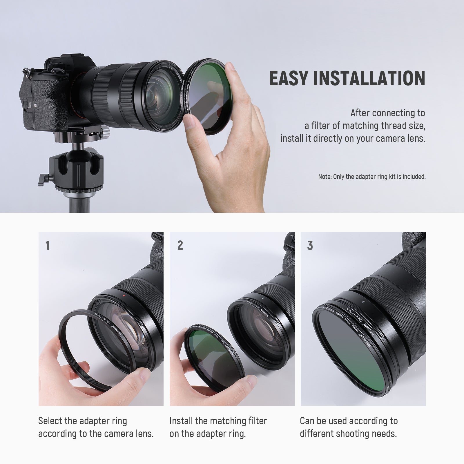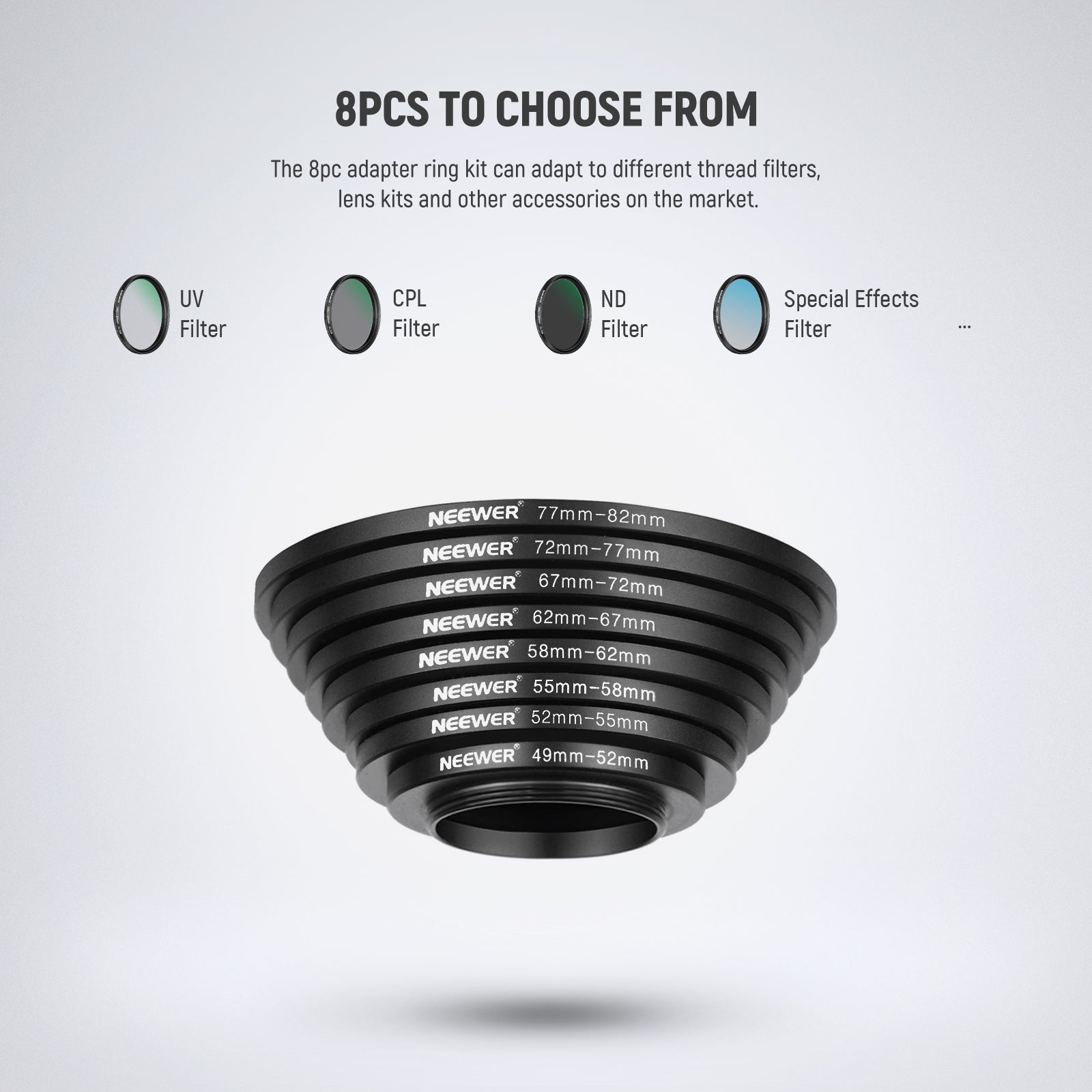 - Neewer Step-up Filter Adapter Ring Set can easily screw onto the front of any lens, and convert the thread size of your lens to the thread size of any other accessory (such as filters, hoods, flashes, and lens converters).