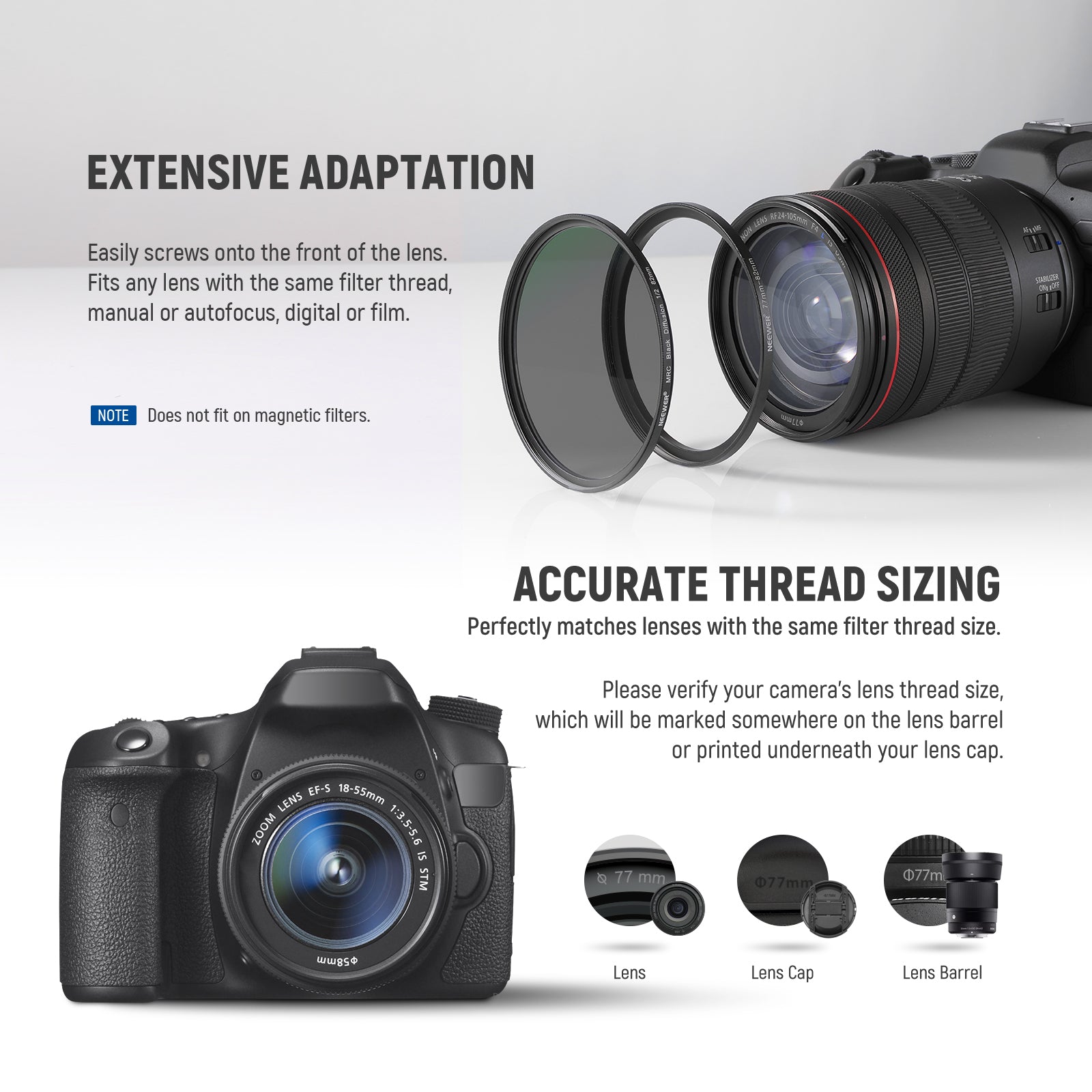 - Fit any lens with the same filter thread, manual or autofocus, digital or film.