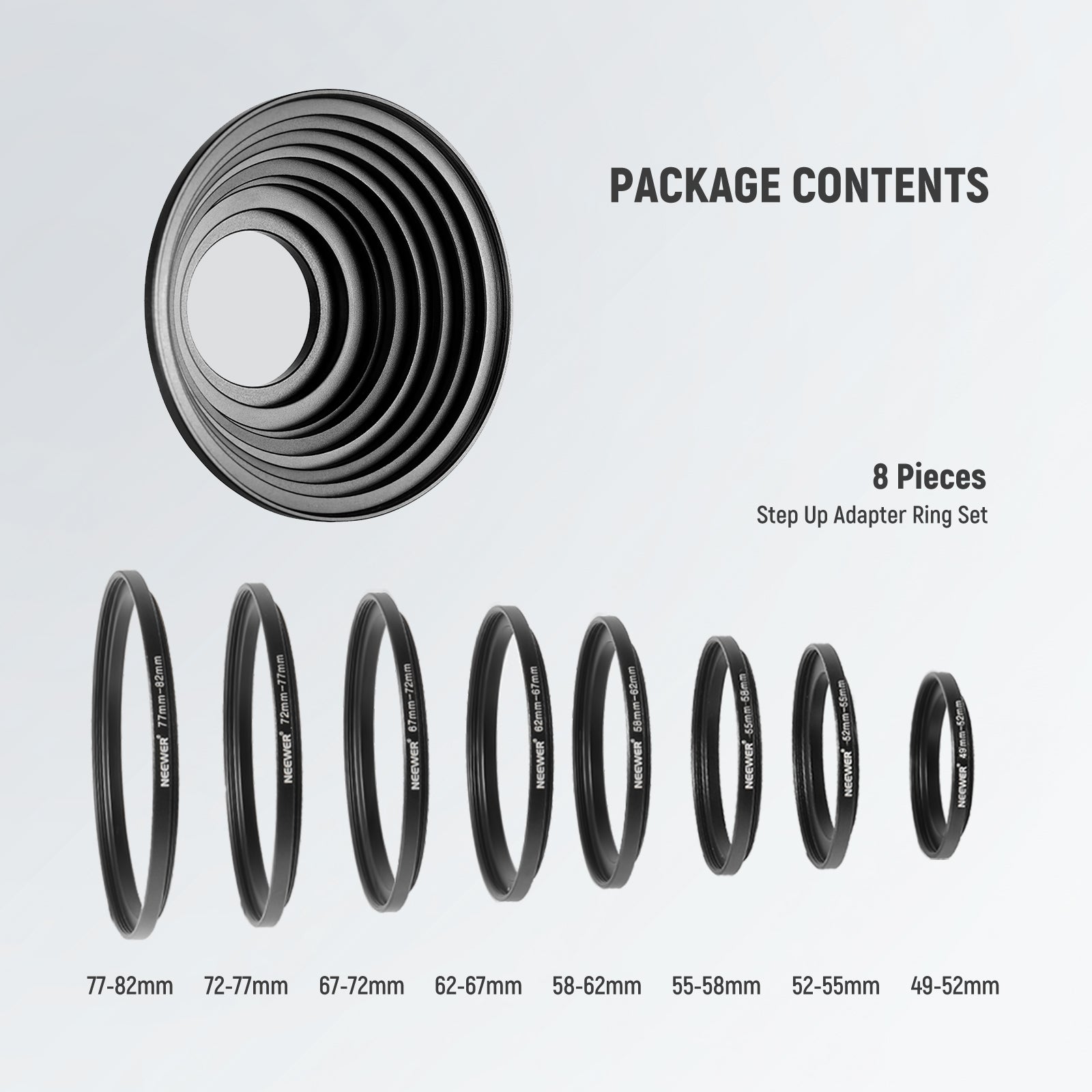 - The Step-up Ring Set includes: (1)49-52mm step-up ring + (1)52-55mm step-up ring + (1)55-58mm step-up ring + (1)58-62mm step-up ring + (1)62-67mm step-up ring + (1)67-72mm step-up ring + (1)72-77mm step-up ring + (1)77-82mm step-up ring.