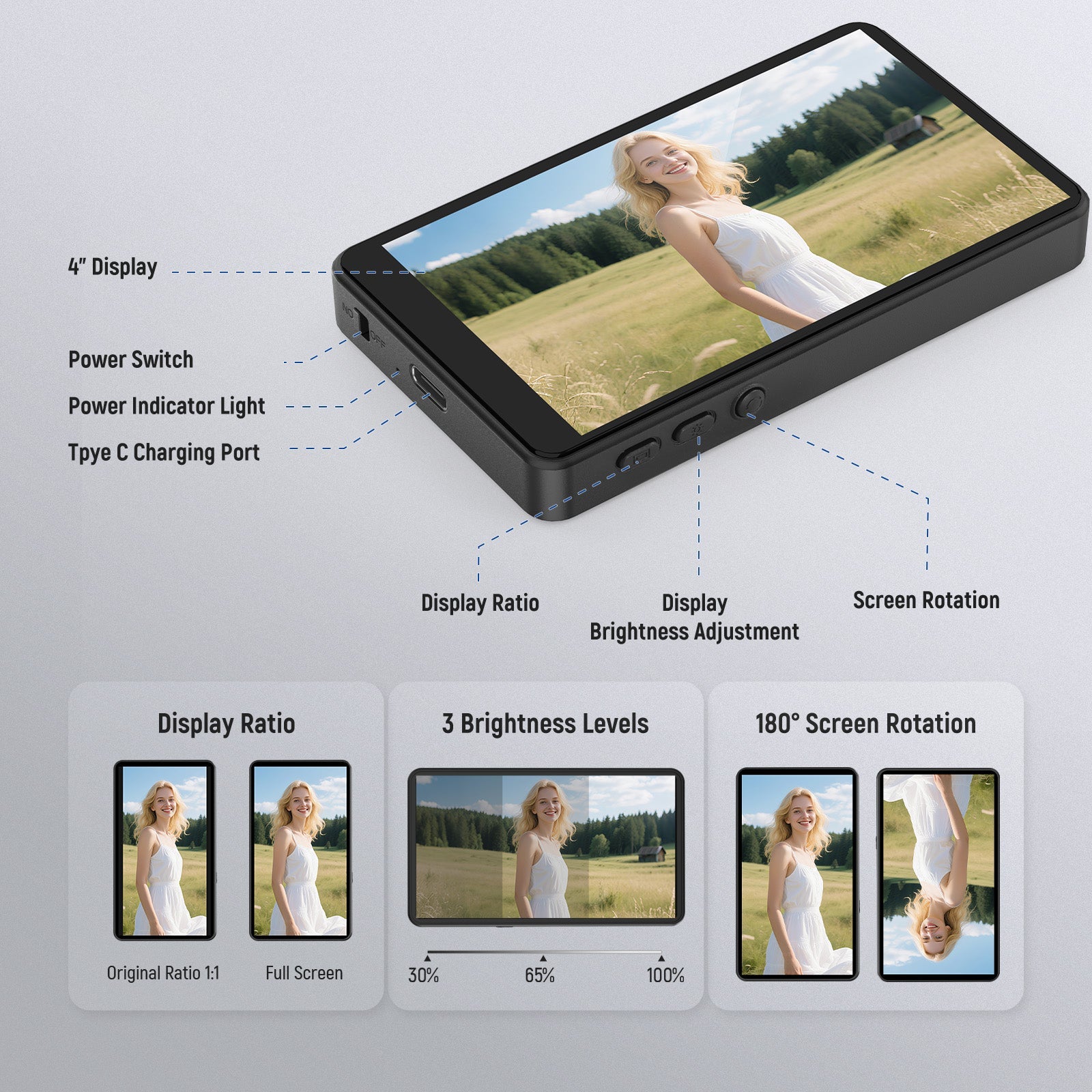 - Lightweight & Portable for Travel Filming- This compact 4" selfie monitor fits easily into your pocket or camera bag for carrying around, or you can always attach it to your phone back, as it's only 3.58oz/101.4g. It is the essential and perfect companion for content creators and influencers