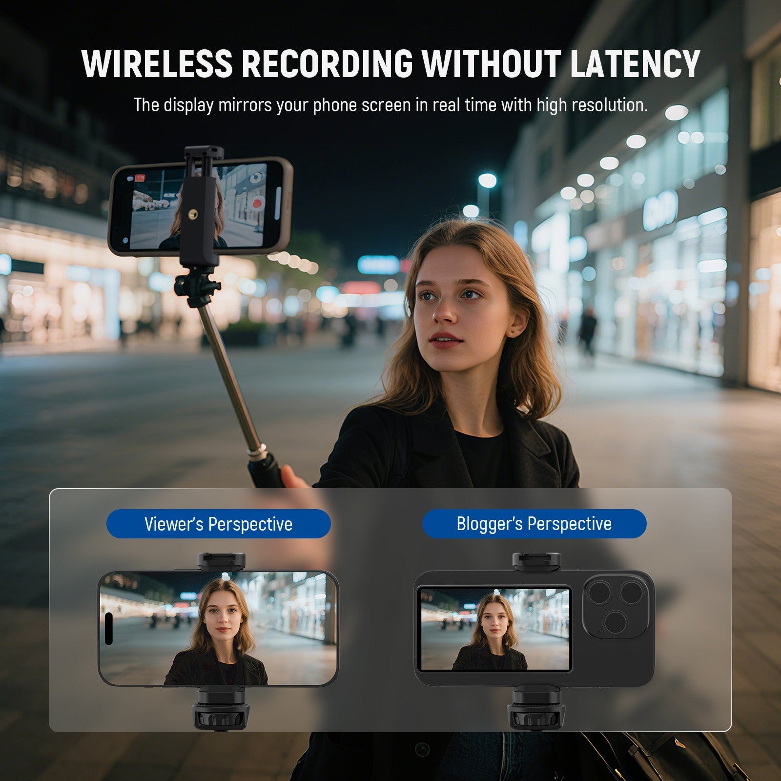 - Wireless Recording without Latency- The phone back camera monitor mirrors your cellphone screen with high resolution in real time, ideal as streamer social media influencer must have for selfies, vlogging, live streaming, for YouTube TikTok video recording, etc. Adjustable brightness ensures clear viewing even in bright light. Enjoy wireless shutter control via the remote