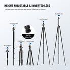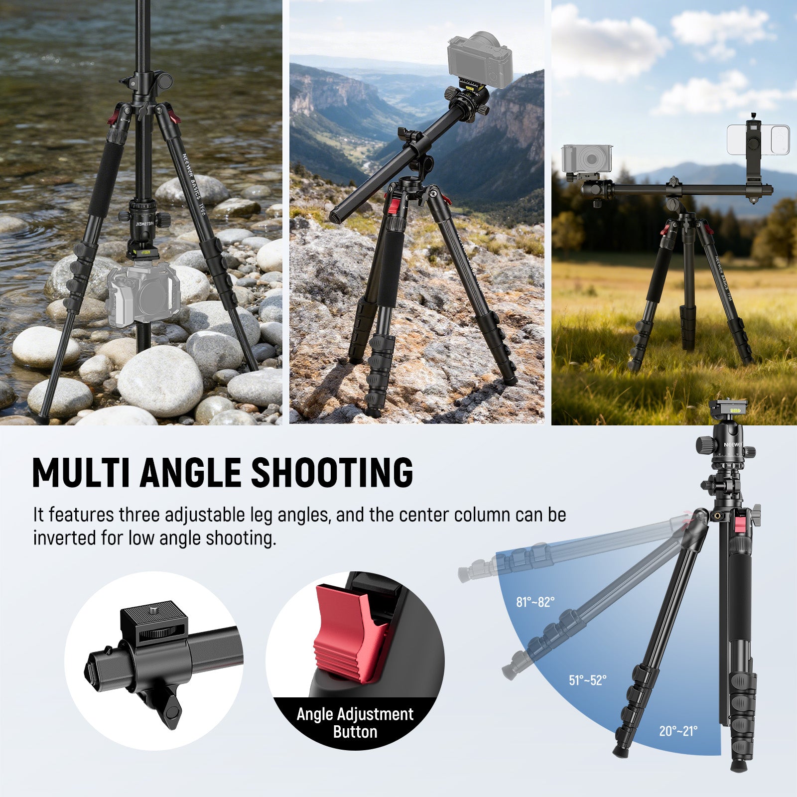 - Smooth & Secure Height Adjustment- Featuring 5 section foldable legs, this professional heavy duty travel tripod for smartphone & camera extends up to 64.5"/164cm and can be effortlessly adjusted and securely locked using flip locks. Its flexible height and angle settings enable versatile overhead compositions for creative shooting. Easily detach one leg to convert the tripod into a monopod for photography and videography