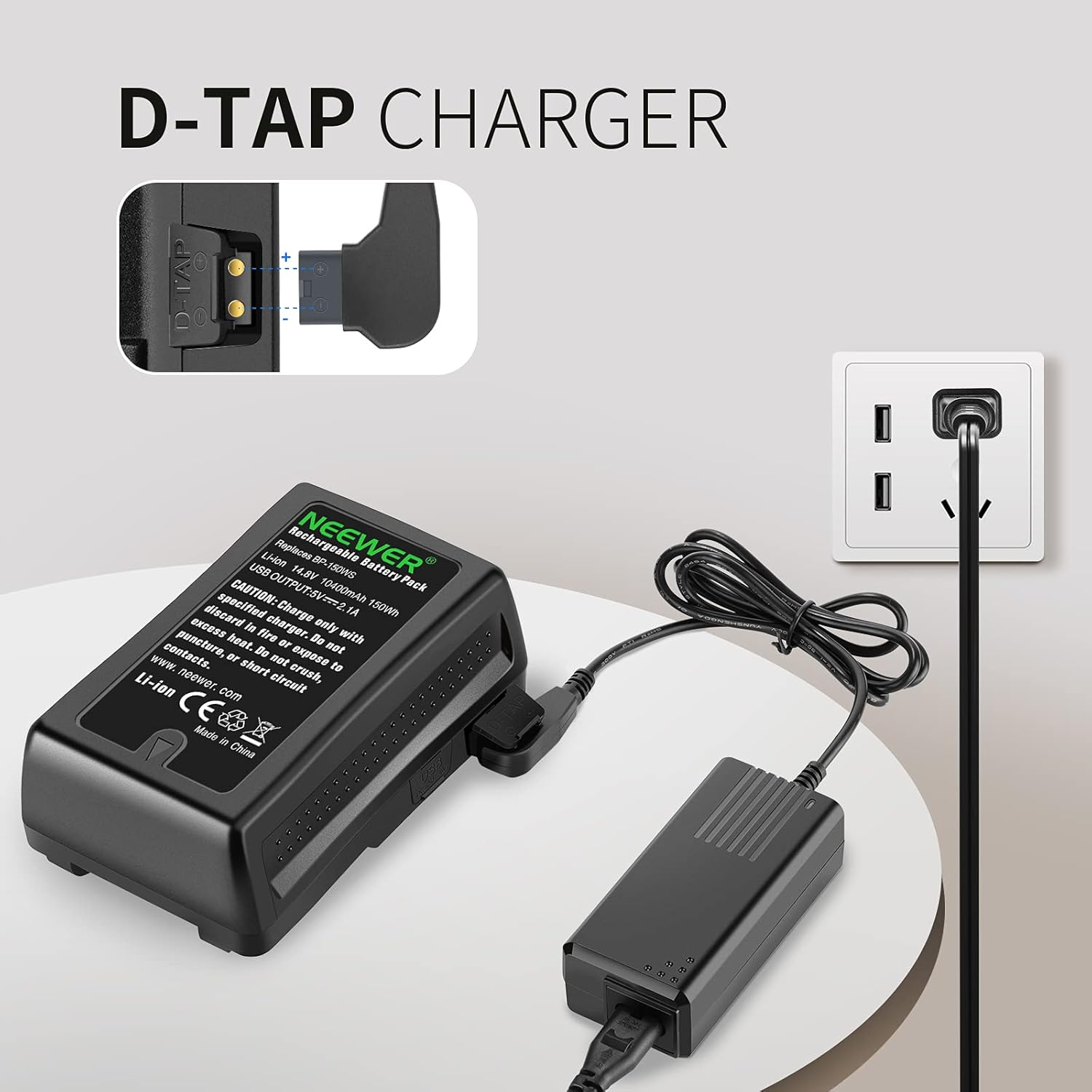 - D-Tap Charging- The V-mount battery features a D-Tap port for charging the battery itself and a 5V 2.1A USB port for charging your mobile devices. The UL-certified D-Tap adapter with a 16.8V 2A output can fully charge the V-mount battery in a short time with ultimate safety