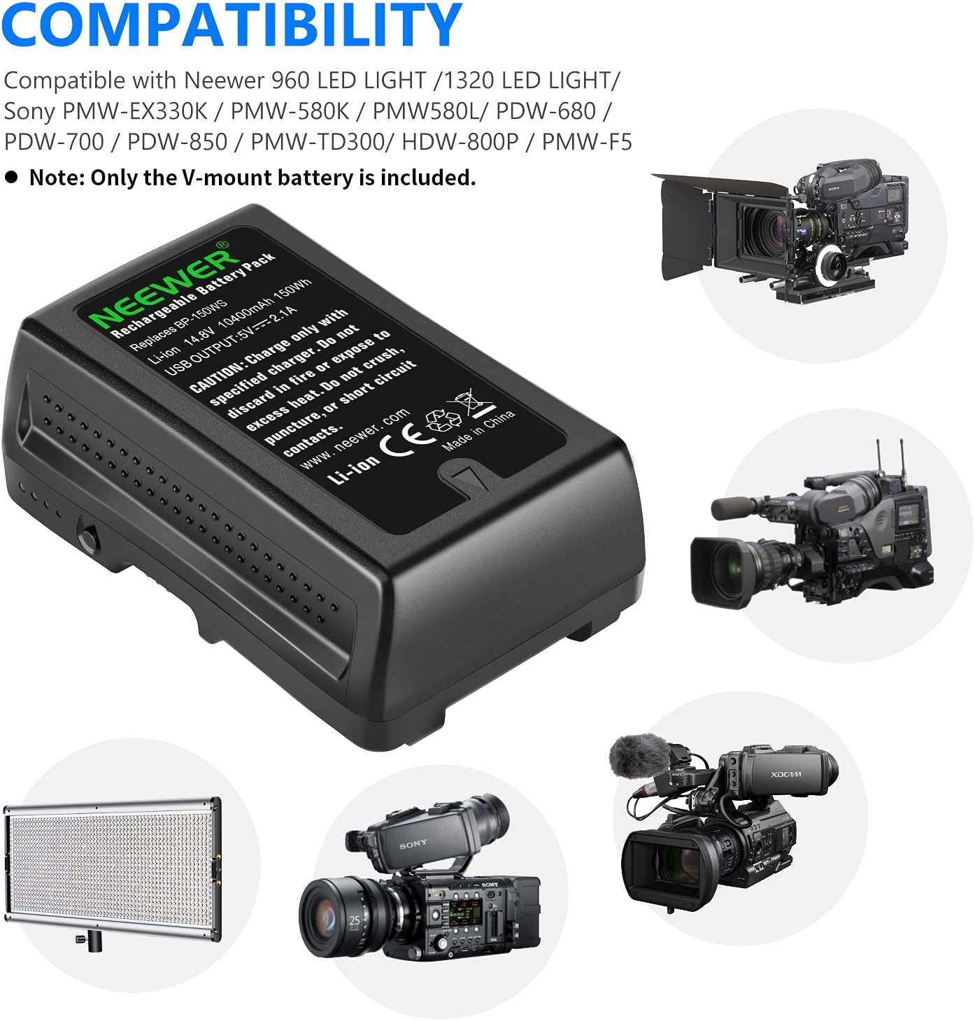 - Wide Applications- Compatible with a wide variety of professional video cameras, camcorders, and LED video lights, including Sony HVR-S270C, PMW-EX330K, PMW-EX330L, PMW-580K, PMW580L, PDW-680, PDW-700, PDW-850, PMW-TD300, HDW-F900R, HDW-680, HDW-800P, PMW-F55, PMW-F5, BMPCC 4K&6K, ARRI Alexa Mini, and more