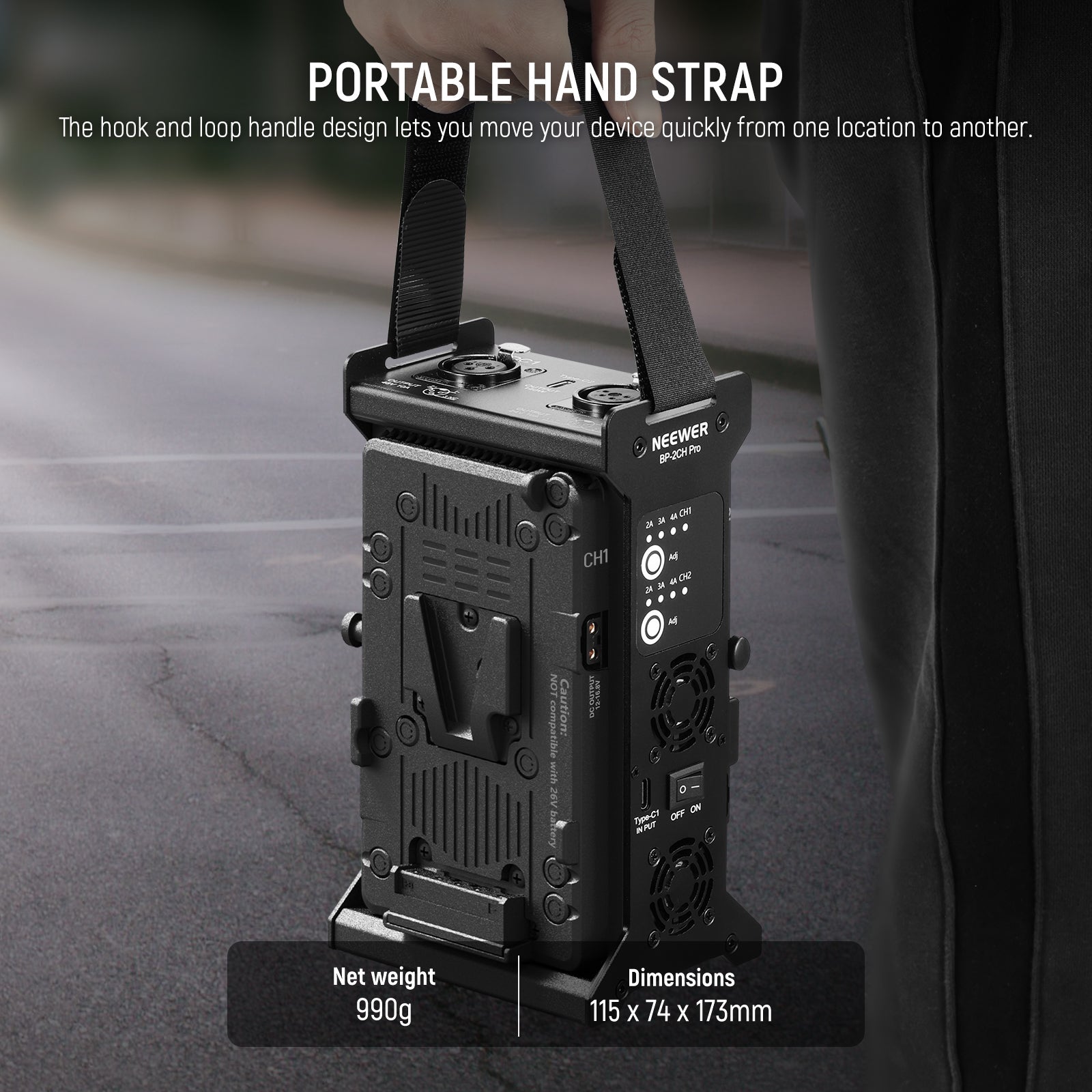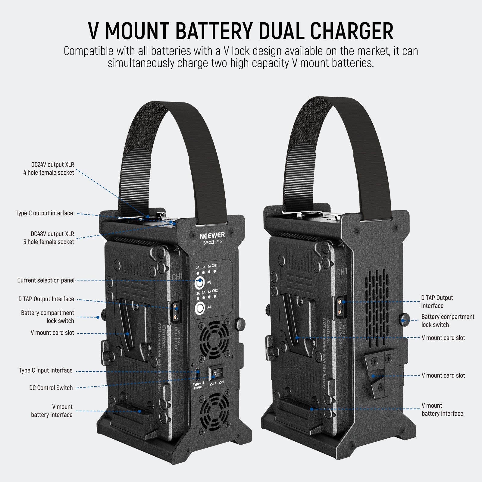 - Efficient Dual Battery Charging- The BP-2CH Pro is an integrated dual channel charger that charges 2 V mount batteries simultaneously, streamlining your workflow and providing quick power backup for your devices without downtime. Ideal for extended shooting in film production, news reporting, wedding photography, commercial advertising, etc. Note: The charger does NOT support simultaneous charging and discharging. The DC ports auto disconnect from the output while the batteries are charging