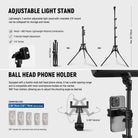 - Adjustable Light Stand & Phone Holder- The 3 section telescopic tripod stands extend up to 59''/150cm and feature a 1/4" ball head that supports 180° vertical tilt and 360° horizontal rotation, catering to various shooting heights and angles. Their reversible legs can fold flat, reducing the stand to a compact 16.9''/43cm size for effortless transport. Additionally, include 2 phone holders that allow 360° swiveling of your smartphones, compatible with devices ranging from 2.36"-3.93"/6-10cm