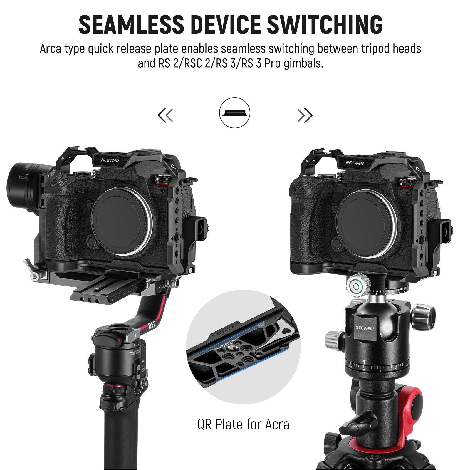 - Arca Type Quick Equipment Switching- The Arca type baseplate is also compatible with DJI RS 2 RSC 2 RS 3 RS 3 Pro gimbals. It can slide into the gimbal’s quick release plate from left or right and let you seamlessly transfer the camera from a tripod to a handheld stabilizer