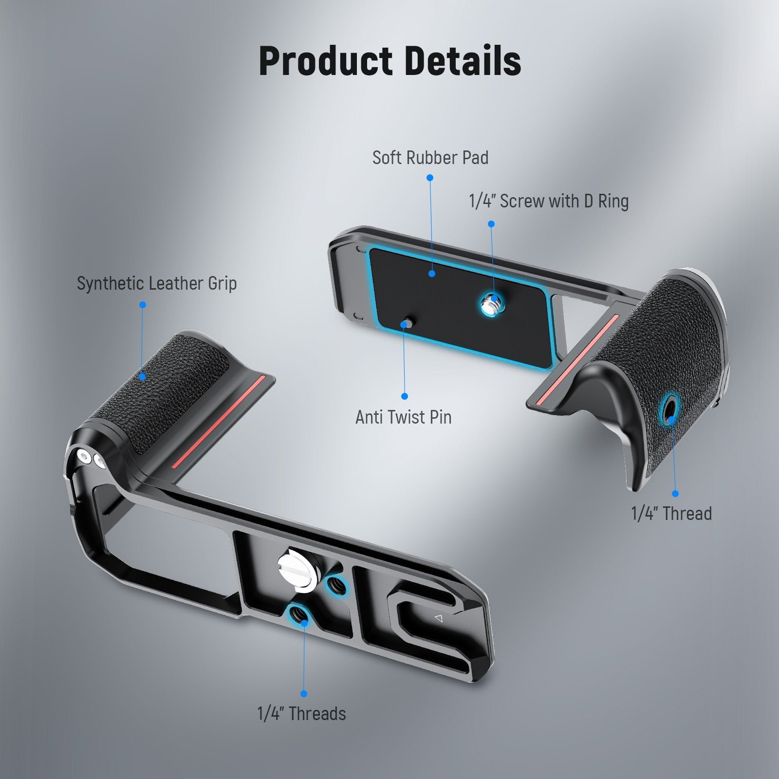 - 1/4" Thread Holes & Cold Shoe- 1/4" threads can connect the baseplate to a camera stand or connect a magic arm (ST15) for functional expansion. A cold shoe can mount a mini microphone (CM14 Pro) or an LED light (PL81) when the camera is mounted vertically