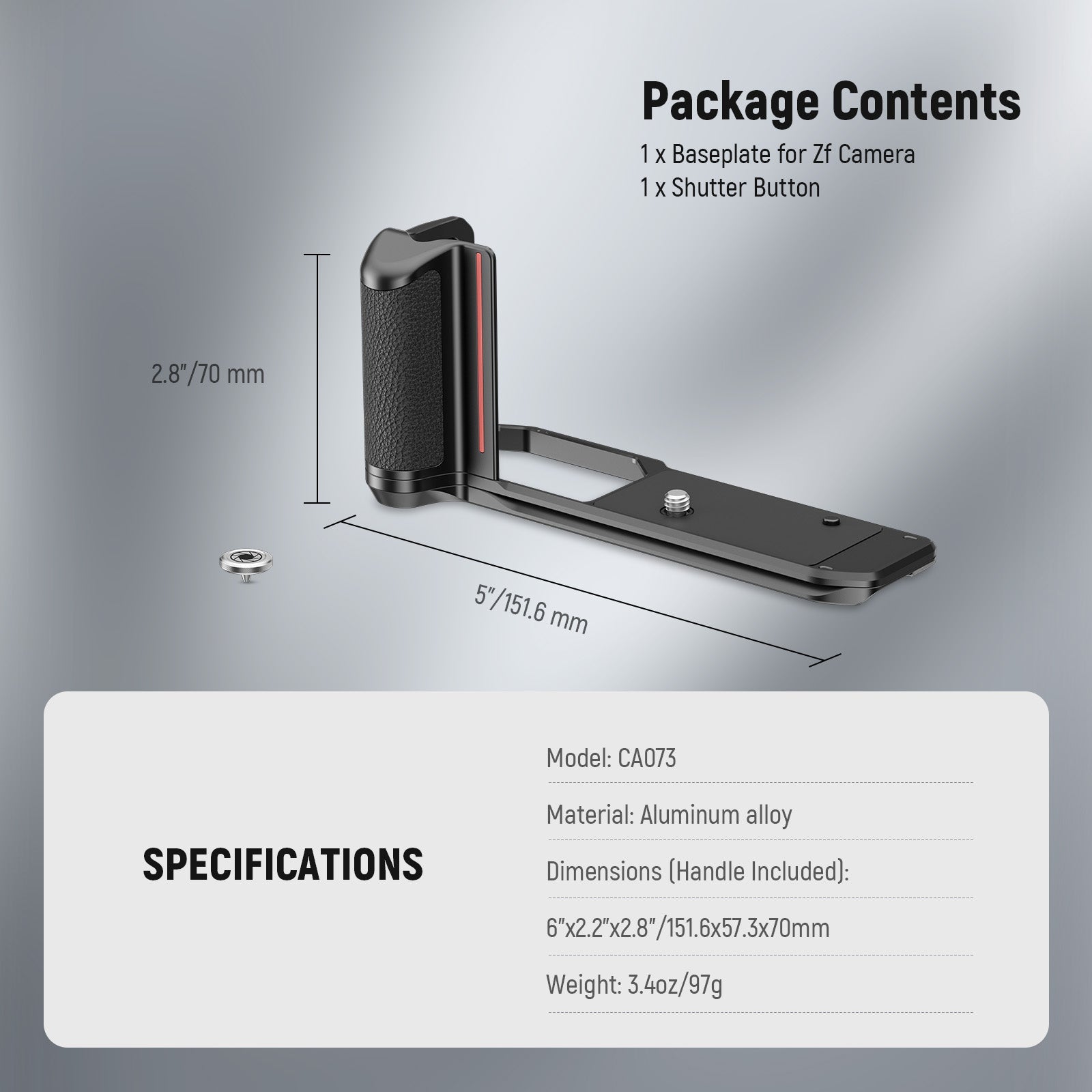 - Lightweight & Slim Structure- Made of durable yet lightweight aluminum alloy, the Zf baseplate weighs just 3.4oz/97g. 0.3"/7mm in thickness, the slim design will retain the nostalgic appearance of your camera