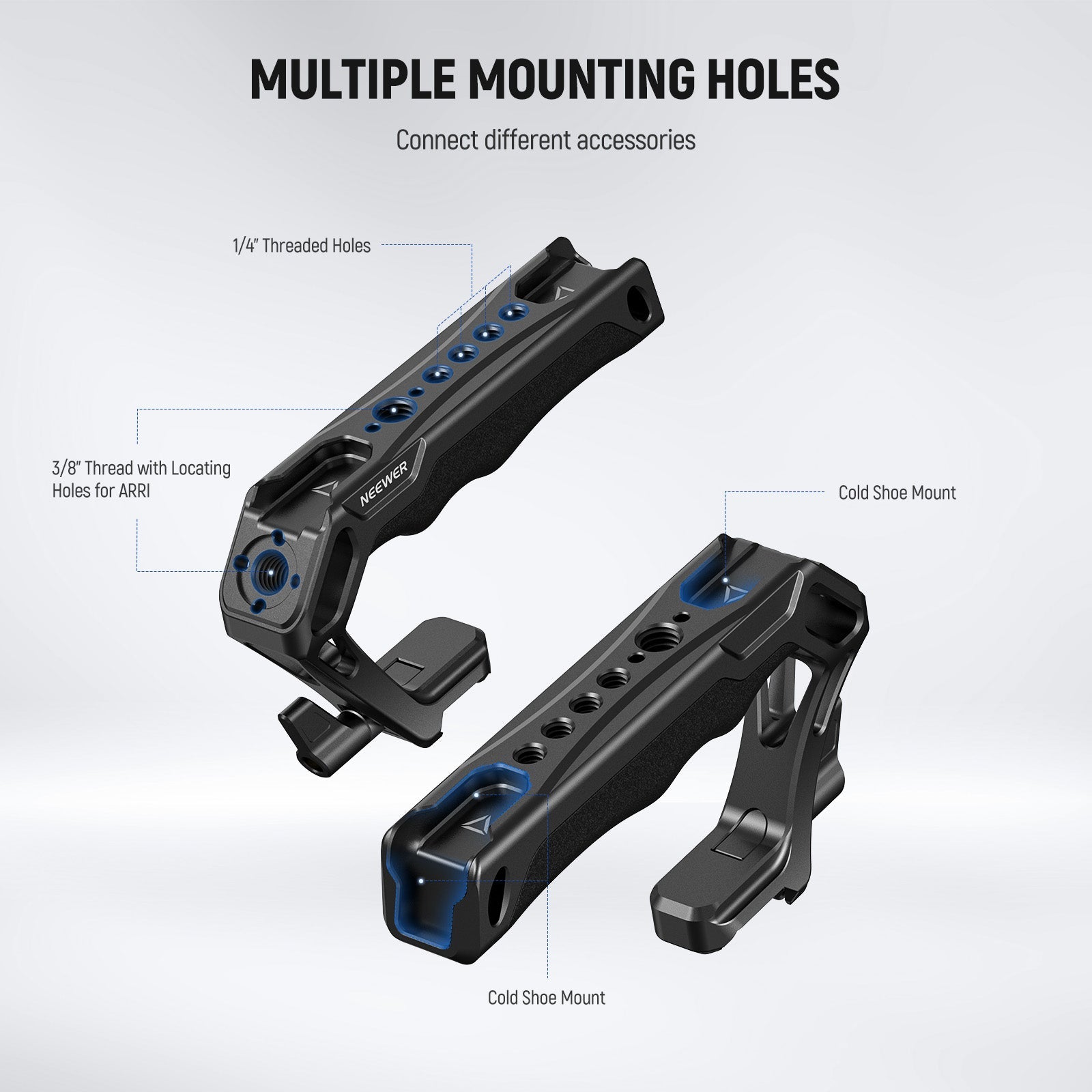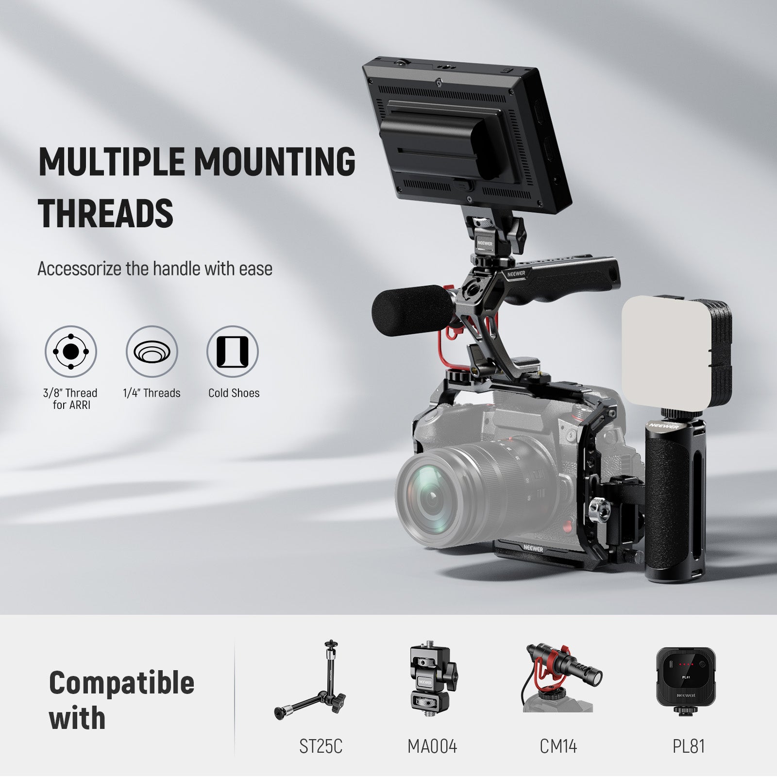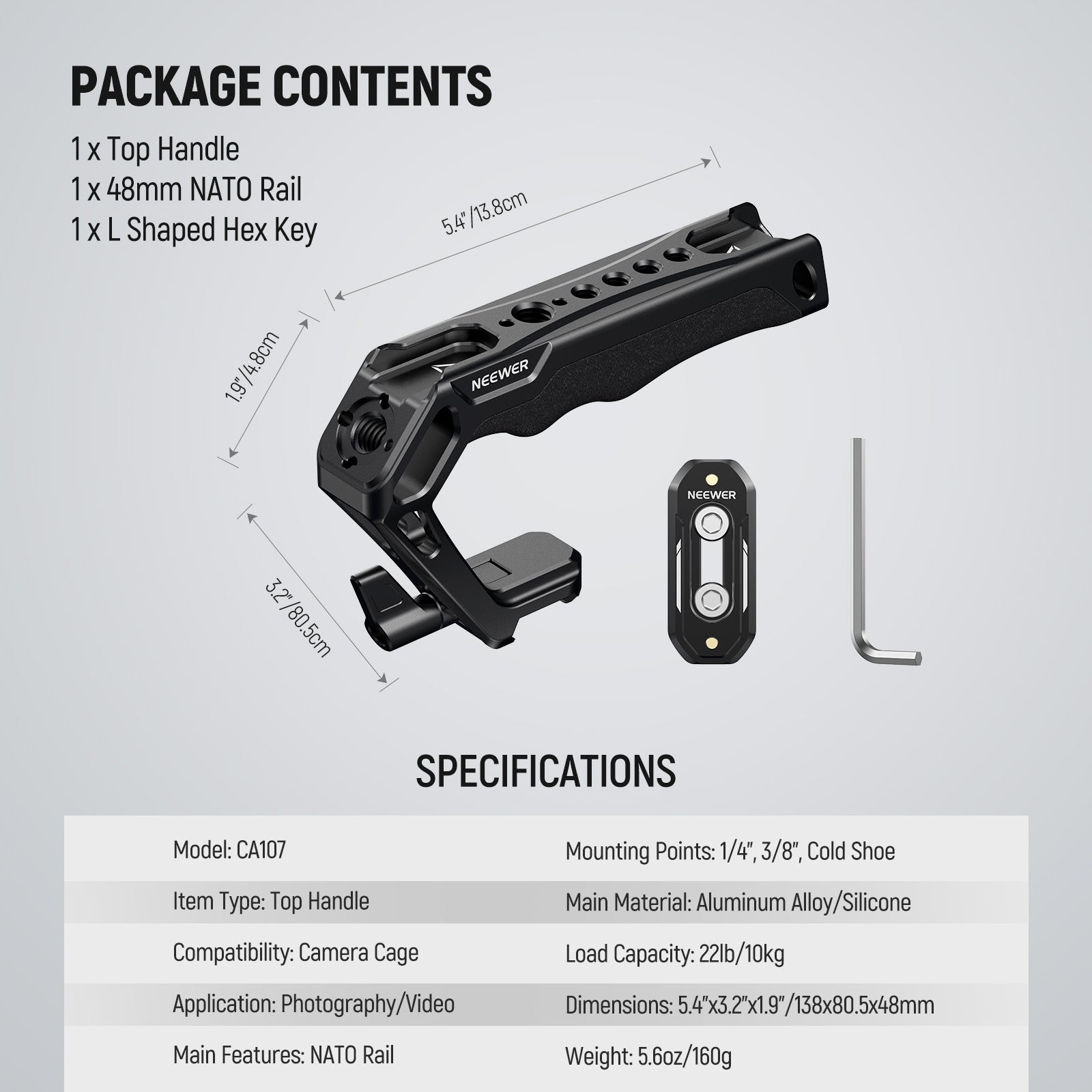 - Top Handle with NATO Rail- This top handle can instantly attach to any camera cage with a NATO rail. For camera rigs and cages without the integrated NATO rail, simply install the supplied 48mm external NATO rail for seamless compatibility. An L shaped hex key is included for quick installation